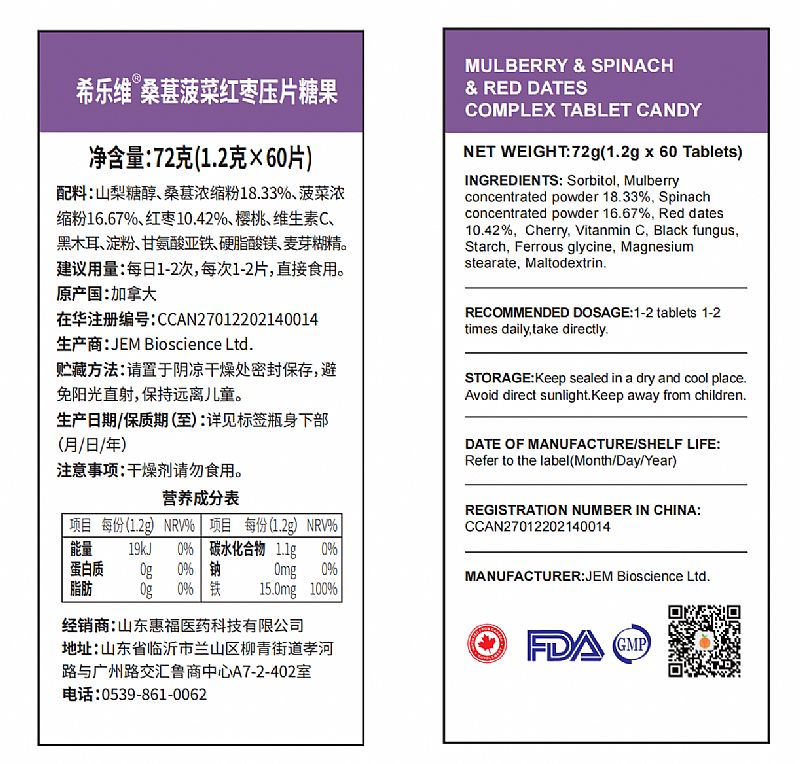 | 主要成分 | 山梨糖醇、桑葚濃縮粉18.33%、菠菜濃縮粉16.67%、紅棗10.42%、櫻桃、維生素C、10.42%,黑木耳、淀粉、甘氨酸業(yè)鐵、硬脂酸鎂、麥芽糊青 |