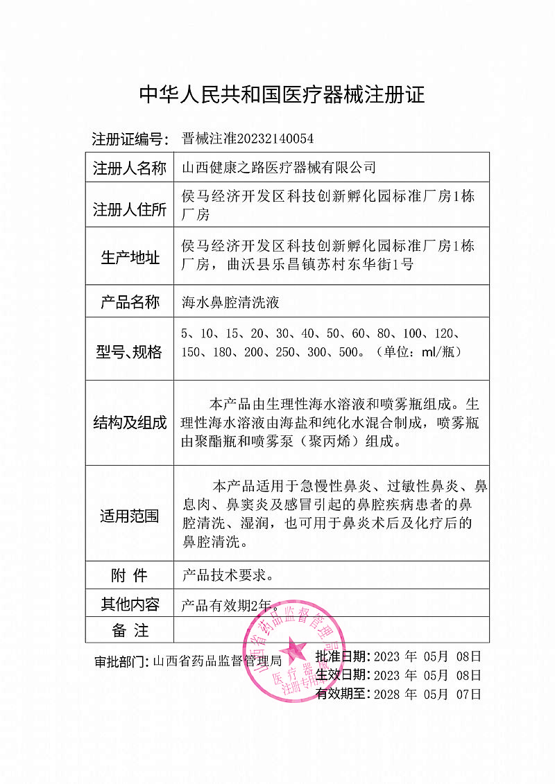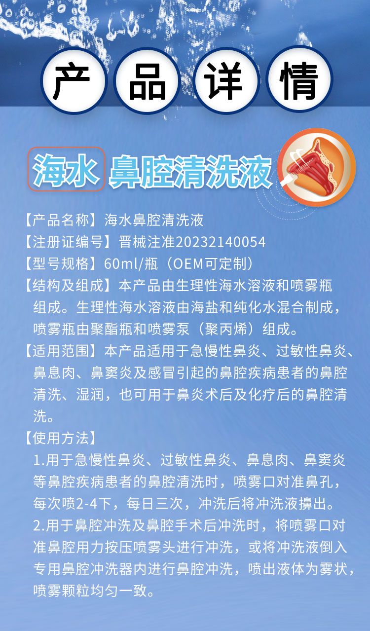 | 補(bǔ)充說明 | 【產(chǎn)品名稱】海水鼻腔清洗液 【型號(hào)、規(guī)格】5ml/瓶、10ml/瓶、15ml/瓶、20ml/瓶、30ml/瓶、40ml/瓶、50ml/瓶、60ml/瓶、80ml/瓶、100ml/瓶、120ml/瓶、150ml/瓶、180ml/瓶、200ml/瓶、250ml/瓶、300ml/瓶、500ml/瓶。 【結(jié)構(gòu)及組成】本產(chǎn)品由生理性海水溶液和噴霧瓶組成。生理性海水溶液由海鹽和純化水混合制成,噴霧瓶由聚酯瓶和噴霧泵(聚丙烯)組成。 【適用范圍】本產(chǎn)品適用于急慢性鼻炎、過敏性鼻炎、鼻息肉、鼻竇炎及感冒引起的鼻腔疾病患者的鼻腔清洗、濕潤(rùn),也可用于鼻炎術(shù)后及化療后的鼻腔清洗。 【產(chǎn)品性能】pH值為6.0-8.0。 【使用方法】 1.用于急慢性鼻炎、過敏性鼻炎、鼻息肉、鼻竇炎等鼻腔疾病患者的鼻腔清洗時(shí), 噴霧口對(duì)準(zhǔn)鼻孔,每次噴2-4下,每日三次,沖洗后將沖洗液擤出。 2.用于鼻腔沖洗及鼻腔手術(shù)后沖洗時(shí),將噴霧口對(duì)準(zhǔn)鼻腔用力按壓噴霧頭進(jìn)行沖洗,或?qū)_洗液倒入專用鼻腔沖洗器內(nèi)進(jìn)行鼻腔沖洗,噴出液體為霧狀,噴霧顆粒均勻一致。 【禁 忌 癥】 1.對(duì)本品過敏者禁用; 2.嚴(yán)重氯化鈉代謝障礙者禁用; 3.糖尿病人、精神病人、認(rèn)知障礙者、過敏體質(zhì)者慎用; 4.孕婦、兒童、體質(zhì)極度虛弱者慎用; 5.鼻腔大面積創(chuàng)傷者禁用; 6.活動(dòng)性鼻出血或既往易鼻出血者慎用。 【注意事項(xiàng)】 1.本品外用,嚴(yán)禁口服; 2.本品性狀改變時(shí)禁止使用; 3.孕婦、兒童在醫(yī)生指導(dǎo)下使用; 4.開封后30天內(nèi)使用; 5.如出現(xiàn)刺激或者發(fā)疹現(xiàn)象,請(qǐng)用清水沖洗,并停止使用。 【貯存】常溫儲(chǔ)存,避免陽(yáng)光直射。 【運(yùn)輸】產(chǎn)品在運(yùn)輸過程中應(yīng)避免日曬、雨淋及重壓。 【配件清單】海水鼻腔清洗液、說明書。 【有 效 期】二年 【生產(chǎn)日期/生產(chǎn)批號(hào)】見外包裝 【醫(yī)療器械生產(chǎn)許可證編號(hào)】晉藥監(jiān)械生產(chǎn)許20200012號(hào) 【醫(yī)療器械注冊(cè)證編號(hào)】晉械注準(zhǔn)20232140054 【醫(yī)療器械產(chǎn)品技術(shù)要求編號(hào)】晉械注準(zhǔn)20232140054 【注冊(cè)人名稱/生產(chǎn)企業(yè)/售后服務(wù)單位】山西健康之路醫(yī)療器械有限公司 |