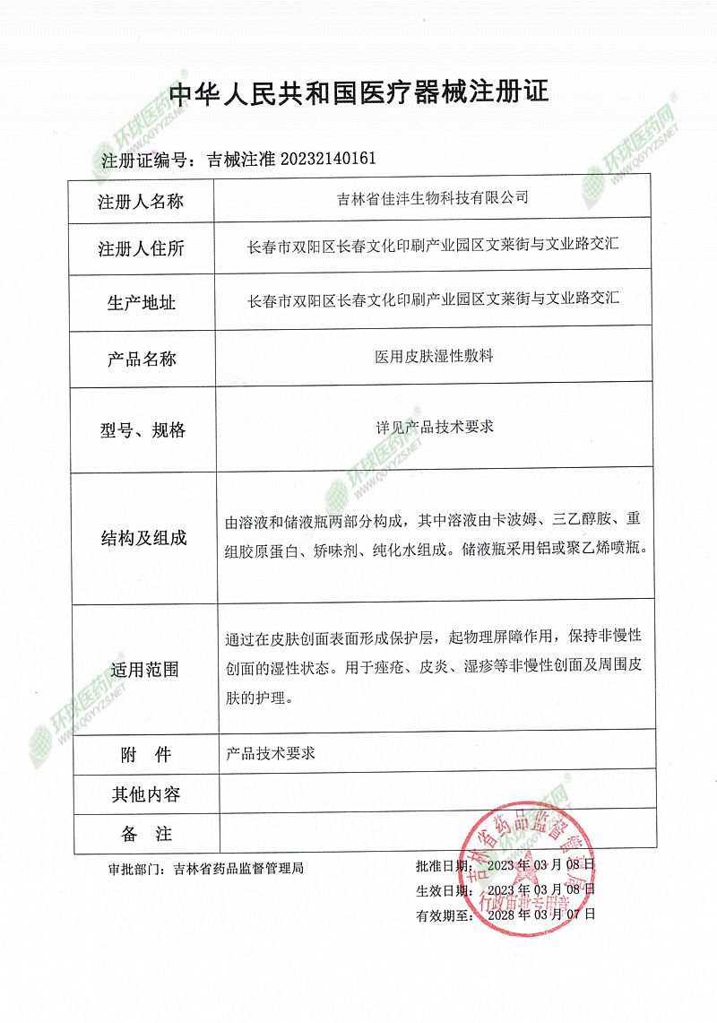 | 補(bǔ)充說明 | 【產(chǎn)品名稱】 醫(yī)用皮膚濕性敷料 【型號(hào)、規(guī)格】 30mL/瓶 【生產(chǎn)許可證編號(hào)】吉藥監(jiān)械生產(chǎn)許20230105號(hào) 【醫(yī)療器械注冊證編號(hào)】吉械注準(zhǔn)20232140161 【產(chǎn)品技術(shù)要求編號(hào)】吉械注準(zhǔn)20232140161 【產(chǎn) 品 性 能 】1、由溶液和儲(chǔ)液瓶兩部分構(gòu)成,其中溶液由卡波姆、三乙醇胺、重組膠原蛋白、矯味劑、純化水組成。儲(chǔ)液瓶采用鋁或聚乙烯噴瓶。 2、溶液顏色為無色或淺黃色、色澤均勻。 3、pH值:應(yīng)為4.5~7.0。 其他詳見產(chǎn)品技術(shù)要求。 【主要結(jié)構(gòu)組成】 醫(yī)用皮膚濕性敷料由溶液和儲(chǔ)液瓶組成。其中溶液由卡波姆、三乙醇胺、重組膠原蛋白、矯味劑、純化水組成。儲(chǔ)液瓶采用鋁或聚乙烯噴瓶。 【適用范圍】 通過在皮膚創(chuàng)面表面形成保護(hù)層,起物理屏障作用,保持非慢性創(chuàng)面的濕性狀態(tài)。用于痤瘡、皮炎、濕疹等非慢性創(chuàng)面及周圍皮膚的護(hù)理。 【使用方法】 將本品噴灑在患處,每日3次,每次4噴,10天為一療程。 【禁 忌 癥】 對本品過敏者禁用。 【注 冊 人、生產(chǎn)企業(yè)、售后服務(wù)單位】 吉林省佳灃生物科技有限公司 【使用期限】 三年 |