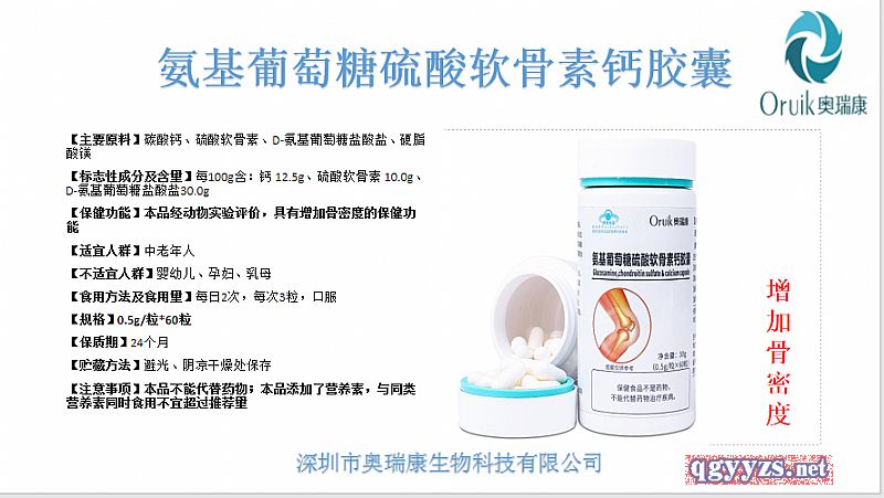 | 補(bǔ)充說明 | 【主要原料】碳酸鈣、硫酸軟骨素、D-氨基葡萄糖鹽酸鹽、硬脂酸鎂 【標(biāo)志性成分及含量】每100g含:鈣 15.6g、硫酸軟骨素 12.2g 【保健功能】本品經(jīng)動(dòng)物實(shí)驗(yàn)評(píng)價(jià),具有增加骨密度的保健功能 【適宜人群】中老年人 【不適宜人群】無 【食用方法及食用量】每日2次,每次3粒,口服 【規(guī)格】0.5g/粒 【保質(zhì)期】24個(gè)月 【貯藏方法】避光、陰涼干燥處保存 |
