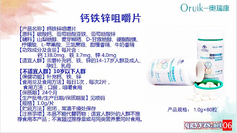 | 補(bǔ)充說(shuō)明 | 【產(chǎn)品名】:鈣鐵鋅硒咀嚼片 招商電話(huà):熊-13045859985 |