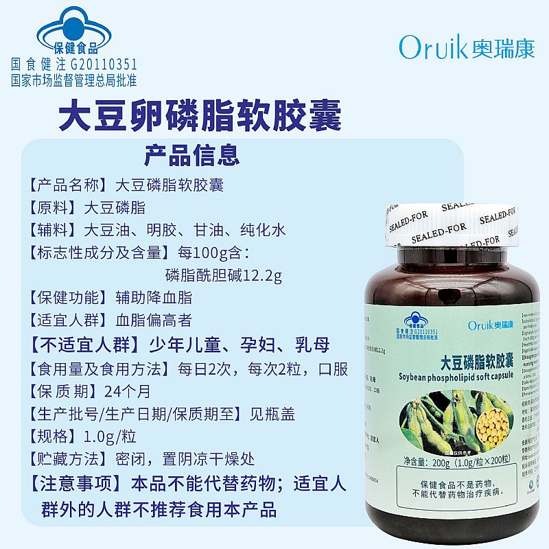 | 補充說明 | 本品是以大豆卵磷脂、大豆油、明膠、純化水、甘油、焦糖色為主要原料制成的保健食品,經(jīng)動物和人體試食功能試驗證明,具有輔助降血脂的保健功能。 【主要原料】大豆卵磷脂、大豆油、明膠、純化水、甘油、焦糖色 【標志性成分及含量】每100g含:磷脂酰膽堿 12.0g 【保健功能】輔助降血脂 【適宜人群】血脂偏高者 【不適宜人群】少年兒童 【食用方法及食用量】每日3次,每次1粒,口服 【規(guī)格】1.2g/粒 【保質(zhì)期】24個月 【貯藏方法】密封,置干燥處 【注意事項】本品不能代替藥物 |
