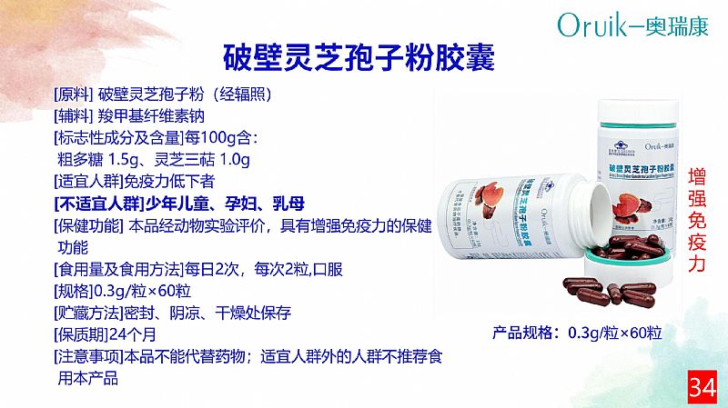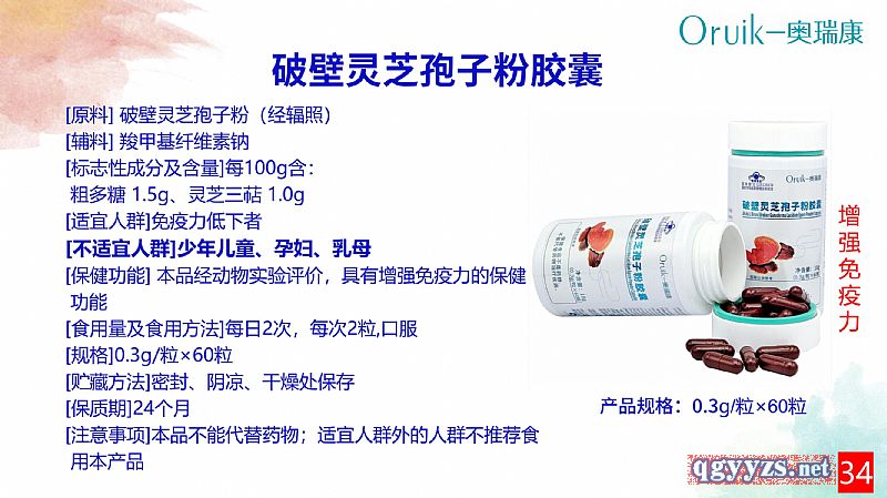 | 補(bǔ)充說明 | 【原料】破壁靈芝孢子粉(經(jīng)輻照) 【輔料】羧甲基纖維素鈉 【標(biāo)志性成分及含量】每100g含:粗多糖 1.5g、靈芝三萜 1.0g 【適宜人群】免疫力低下者 【不適宜人群】少年兒童、孕婦、乳母 【保健功能】本品經(jīng)動物實(shí)驗(yàn)評價(jià),具有增強(qiáng)免疫力的保健功能 【食用量及食用方法】每日2次,每次2粒,口服 【規(guī)格】0.3g/粒 【貯藏方法】密封、陰涼、干燥處保存 【保質(zhì)期】24個(gè)月 【注意事項(xiàng)】本品不能代替藥物;適宜人群外的人群不推薦食用本產(chǎn)品 |