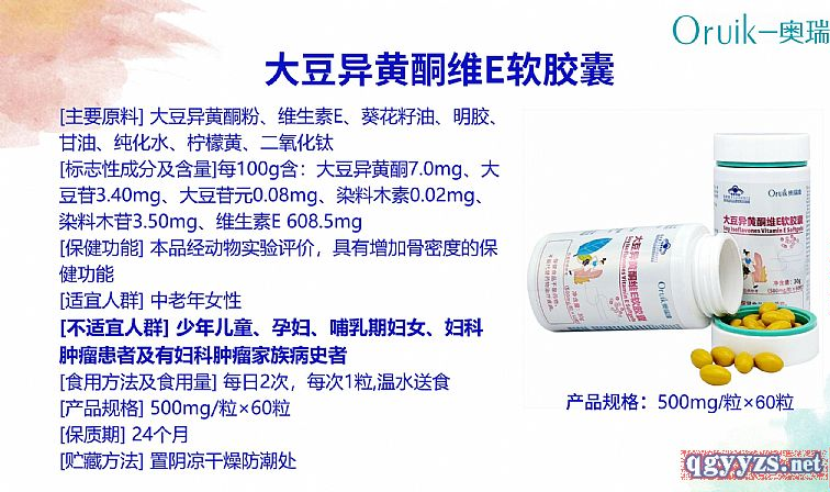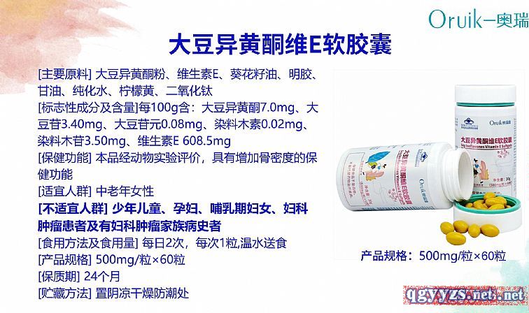 | 補充說明 | 本品是以大豆異黃酮粉、維生素E、葵花籽油、明膠、甘油、純化水、檸檬黃、二氧化鈦為主要原料制成的保健食品,經(jīng)動物功能試驗證明,具有增加骨密度的保健功能。 【主要原料】大豆異黃酮粉、維生素E、葵花籽油、明膠、甘油、純化水、檸檬黃、二氧化鈦 【標志性成分及含量】每100g含:大豆異黃酮7.0mg、大豆苷3.40mg、大豆苷元0.08mg、染料木素0.02mg、染料木苷3.50mg、維生素E 608.5mg 【保健功能】本品經(jīng)動物實驗評價,具有增加骨密度的保健功能 【適宜人群】中老年女性 【不適宜人群】 少年兒童、孕婦、哺乳期婦女、婦科腫瘤患者及有婦科腫瘤家族病史者 【食用方法及食用量】 每日2次,每次1粒,溫水送食 【產(chǎn)品規(guī)格】500mg/粒 【保質(zhì)期】24個月 【貯藏方法】置陰涼干燥防潮處 【注意事項】本品不能代替藥物;不宜與含大豆異黃酮成分的產(chǎn)品同時食用,長期食用注意婦科檢查;本品添加了營養(yǎng)素,與同類營養(yǎng)素同時食用不宜超過推薦量 |
