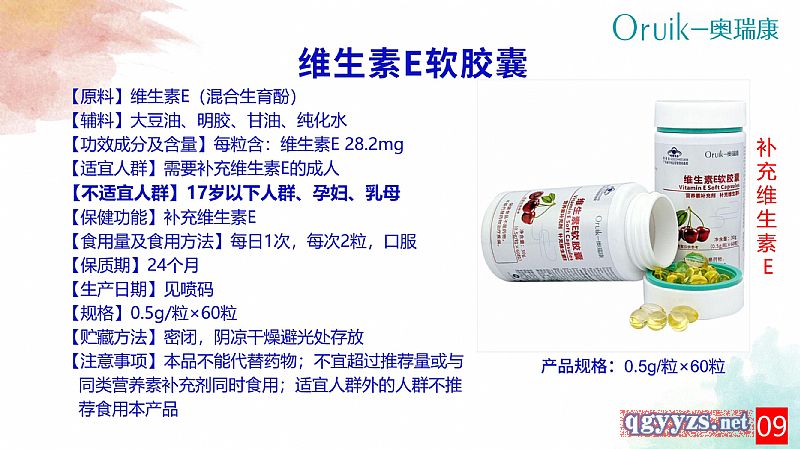 | 補充說明 | 【原料】維生素E(混合生育酚) 【輔料】大豆油、明膠、甘油、純化水 【功效成分及含量】每粒含:維生素E 28.2mg 【適宜人群】需要補充維生素E的成人 【不適宜人群】17歲以下人群、孕婦、乳母 【保健功能】補充維生素E 【食用量及食用方法】每日1次,每次2粒,口服 【保質(zhì)期】24個月 【生產(chǎn)日期】見噴碼 【規(guī)格】0.5g/粒 【貯藏方法】密閉,陰涼干燥避光處存放 【注意事項】本品不能代替藥物;不宜超過推薦量或與同類營養(yǎng)素補充劑同時食用;適宜人群外的人群不推薦食用本產(chǎn)品 |