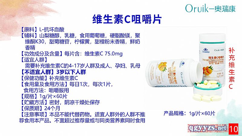 | 補充說明 | 【原料】L-抗壞血酸 【輔料】山梨糖醇,乳糖,食用葡萄糖,硬脂酸鎂,聚維酮K30,甜菊糖苷,檸檬黃,甜橙粉末香精,鮮奶香精 【功效成分及含量】每片含:維生素C 75.0mg 【適宜人群】需要補充維生素C的4-17歲人群及成人、孕婦、乳母 【不適宜人群】3歲以下人群 【保健功能】補充維生素C 【食用量及食用方法】每日1次,每次1片,食用方法:咀嚼服用 【規(guī)格】1g/片 【貯藏方法】密封,陰涼干燥處保存 【保質(zhì)期】24個月 【注意事項】本品不能代替藥物。適宜人群外的人群不推薦食用本產(chǎn)品。不宜超過推薦量或與同類營養(yǎng)素同時食用 |