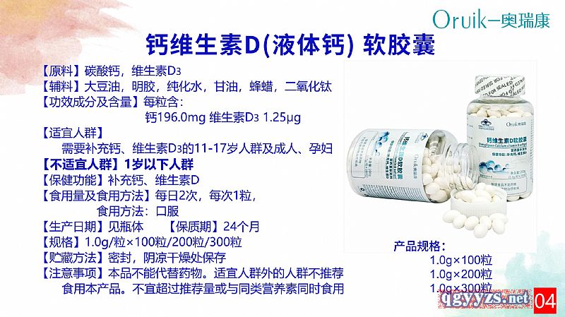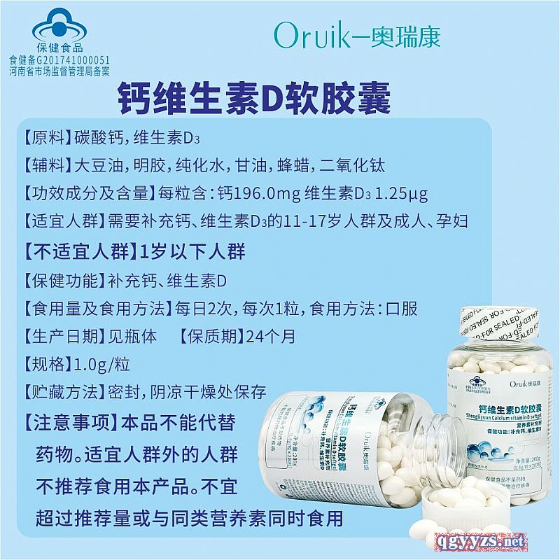 | 補充說明 | 【原料】碳酸鈣,維生素D3 【輔料】大豆油,明膠,純化水,甘油,蜂蠟,二氧化鈦 【功效成分及含量】每粒含:鈣196.0mg 維生素D3 1.25μg 【適宜人群】需要補充鈣、維生素D3的11-17歲人群及成人、孕婦 【不適宜人群】1歲以下人群 【保健功能】補充鈣、維生素D 【食用量及食用方法】每日2次,每次1粒,食用方法:口服 【生產(chǎn)日期】見瓶體 【保質(zhì)期】24個月 【規(guī)格】1.0g/粒 【貯藏方法】密封,陰涼干燥處保存 【注意事項】本品不能代替藥物。適宜人群外的人群不推薦食用本產(chǎn)品。不宜超過推薦量或與同類營養(yǎng)素同時食用 |
