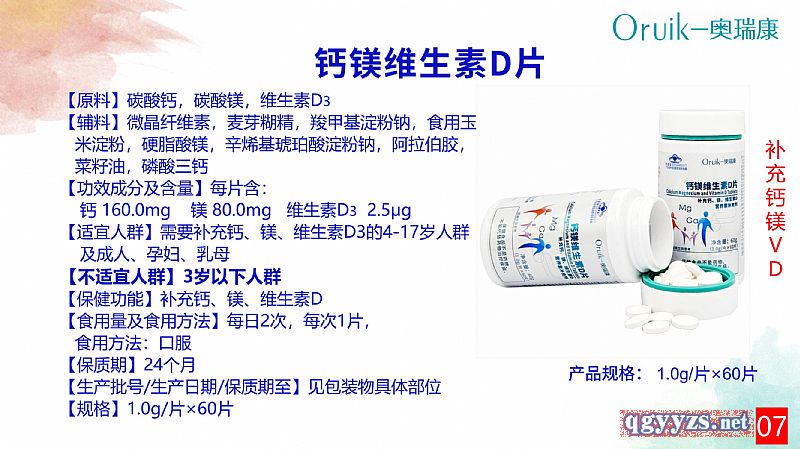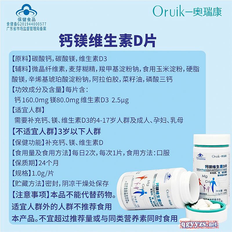 | 補(bǔ)充說明 | 【原料】碳酸鈣,碳酸鎂,維生素D3 【輔料】微晶纖維素,麥芽糊精,羧甲基淀粉鈉,食用玉米淀粉,硬脂酸鎂,辛烯基琥珀酸淀粉鈉,阿拉伯膠,菜籽油,磷酸三鈣 【功效成分及含量】每片含:鈣 160.0mg 鎂80.0mg 維生素D3 2.5μg 【適宜人群】需要補(bǔ)充鈣、鎂、維生素D3的4-17歲人群及成人、孕婦、乳母 【不適宜人群】3歲以下人群 【保健功能】補(bǔ)充鈣、鎂、維生素D 【食用量及食用方法】每日2次,每次1片,食用方法:口服 【保質(zhì)期】24個月 【生產(chǎn)批號/生產(chǎn)日期/保質(zhì)期至】見包裝物具體部位 【規(guī)格】1.0g/片 【貯藏方法】密封,陰涼干燥處保存 【注意事項】本品不能代替藥物。適宜人群外的人群不推薦食用本產(chǎn)品。不宜超過推薦量或與同類營養(yǎng)素同時食用 |