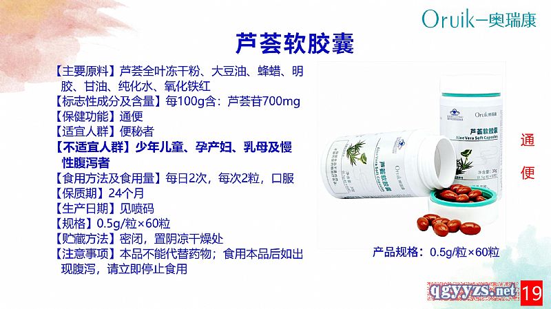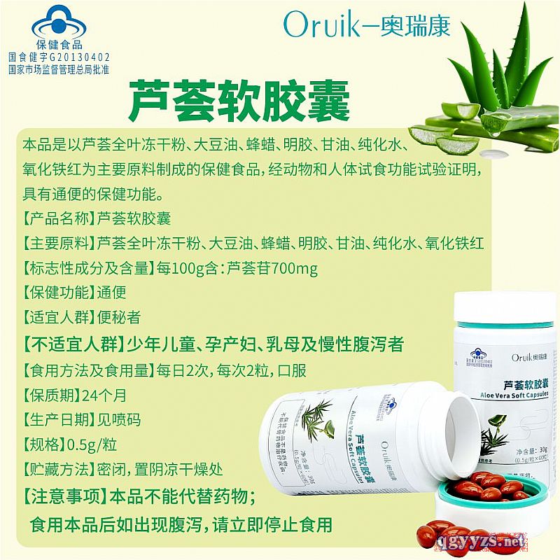 | 補(bǔ)充說明 | 【主要原料】蘆薈全葉凍干粉、大豆油、蜂蠟、明膠、甘油、純化水、氧化鐵紅 【標(biāo)志性成分及含量】每100g含:蘆薈苷700mg 【保健功能】通便 【適宜人群】便秘者 【不適宜人群】少年兒童、孕產(chǎn)婦、乳母及慢性腹瀉者 【食用方法及食用量】每日2次,每次2粒,口服 【保質(zhì)期】24個月 【生產(chǎn)日期】見噴碼 【規(guī)格】0.5g/粒 【貯藏方法】密閉,置陰涼干燥處 【注意事項(xiàng)】本品不能代替藥物;食用本品后如出現(xiàn)腹瀉,請立即停止食用 |