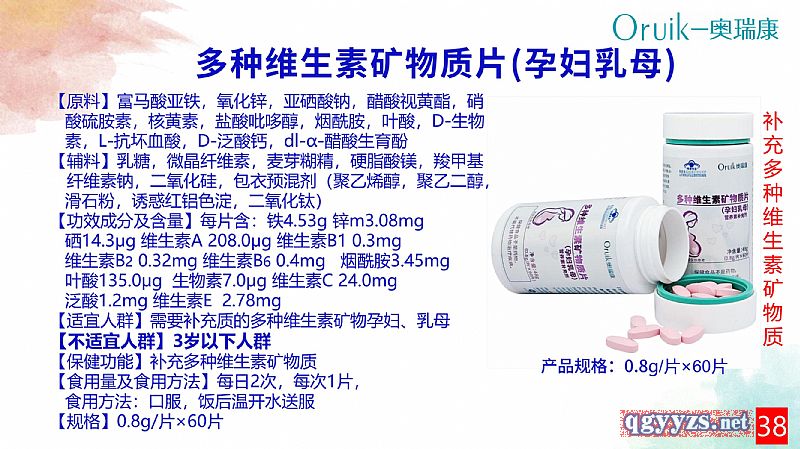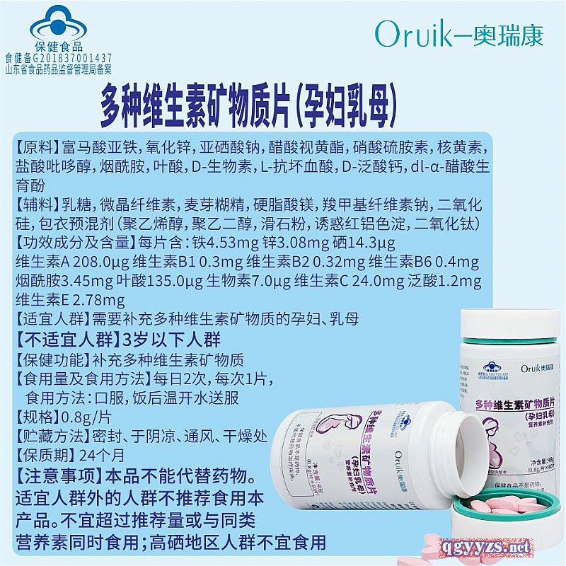 | 補(bǔ)充說(shuō)明 | 【原料】富馬酸亞鐵,氧化鋅,亞硒酸鈉,醋酸視黃酯,硝酸硫胺素,核黃素,鹽酸吡哆醇,煙酰胺,葉酸,D-生物素,L-抗壞血酸,D-泛酸鈣,dl-α-醋酸生育酚 【輔料】乳糖,微晶纖維素,麥芽糊精,硬脂酸鎂,羧甲基纖維素鈉,二氧化硅,包衣預(yù)混劑(聚乙烯醇,聚乙二醇,滑石粉,誘惑紅鋁色淀,二氧化鈦) 【功效成分及含量】每片含:鐵4.53mg 鋅3.08mg 硒14.3μg 維生素A 208.0μg 維生素B1 0.3mg 維生素B2 0.32mg 維生素B6 0.4mg煙酰胺3.45mg 葉酸135.0μg 生物素7.0μg 維生素C 24.0mg 泛酸1.2mg 維生素E 2.78mg 【適宜人群】需要補(bǔ)充多種維生素礦物質(zhì)的孕婦、乳母 【不適宜人群】3歲以下人群 【保健功能】補(bǔ)充多種維生素礦物質(zhì) 【食用量及食用方法】每日2次,每次1片,食用方法:口服,飯后溫開(kāi)水送服 【規(guī)格】0.8g/片 【貯藏方法】密封、于陰涼、通風(fēng)、干燥處 【保質(zhì)期】 24個(gè)月 【注意事項(xiàng)】本品不能代替藥物。適宜人群外的人群不推薦食用本產(chǎn)品。不宜超過(guò)推薦量或與同類營(yíng)養(yǎng)素同時(shí)食用;高硒地區(qū)人群不宜食用 |