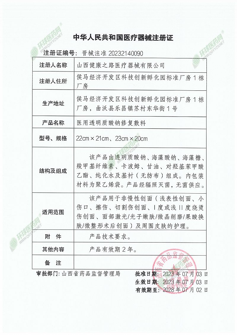 | 補(bǔ)充說(shuō)明 | 【產(chǎn)品名稱(chēng)】醫(yī)用透明質(zhì)酸鈉修復(fù)敷料 【型號(hào)、規(guī)格】22cm×21cm、23cm×20cm 【結(jié)構(gòu)及組成】該產(chǎn)品由透明質(zhì)酸鈉、海藻酸鈉、海藻糖、羧甲基纖維素、卡波姆、甘油、對(duì)羥基苯甲酸乙酯、純化水及基襯(無(wú)紡布)組成。內(nèi)包裝材料為聚乙烯袋。產(chǎn)品經(jīng)輻照滅菌,無(wú)菌供應(yīng)。 【產(chǎn)品性能】pH值范圍為5.0~7.0;重金屬含量(以Pb2+計(jì))應(yīng)不大于10μg/g;本品應(yīng)無(wú)菌。 【適用范圍】該產(chǎn)品用于非慢性創(chuàng)面(淺表性創(chuàng)面、小傷口、擦傷、切割傷創(chuàng)面、I度或淺II度的燒燙傷創(chuàng)面、面部激光/光子嫩膚/微晶削磨/果酸換膚/微整形術(shù)后創(chuàng)面)及周?chē)つw的護(hù)理。 【使用方法】外用。清潔患處皮膚,打開(kāi)本品外包裝,取出醫(yī)用透明質(zhì)酸鈉修復(fù)敷料展開(kāi),敷于面部皮膚上,輕壓使無(wú)紡布貼緊皮膚。 【禁 忌 癥】 1.對(duì)本品過(guò)敏者禁用; 2.孕婦慎用或遵醫(yī)囑; 3.嚴(yán)重感染和膿胞者在炎癥未得到有效控制前不宜使用; 4.本品僅供一次性使用,包裝破損禁止使用。 【注意事項(xiàng)】 1.本品為一次性外用品,禁止內(nèi)服,不使用切勿打開(kāi)。 2.置于兒童不易觸及到的地方。 3.產(chǎn)品使用期間不宜食辛辣、油膩、刺激性食物,不宜飲酒和吸煙。 4.切勿接觸眼睛,如接觸眼睛,請(qǐng)用大量清水沖洗。 5.請(qǐng)勿吞食,如被吞食,請(qǐng)用大量清水漱口,并喝大量清水,及時(shí)就醫(yī)。 6.如用后患處感覺(jué)不適,應(yīng)暫停使用,癥狀消失后可以繼續(xù)使用。 7.本品性狀發(fā)生改變時(shí)禁止使用。 8.兒童必須在成人監(jiān)護(hù)下使用。 9.如正在使用其他藥品,使用本品前請(qǐng)咨詢(xún)醫(yī)師或藥師。 10.使用前請(qǐng)閱讀說(shuō)明書(shū),在產(chǎn)品有效期內(nèi)使用,超過(guò)有效期禁止使用。 11.使用前確認(rèn)包裝是否完整,如遇破損,切勿使用。 12.本品極少發(fā)生過(guò)敏反應(yīng),一旦出現(xiàn)過(guò)敏反應(yīng),應(yīng)停用本品。 【貯存】應(yīng)貯存在通風(fēng)干燥處,無(wú)腐蝕性氣體和通風(fēng)良好的室內(nèi)。 【運(yùn)輸】產(chǎn)品在運(yùn)輸過(guò)程中應(yīng)避免日曬、雨淋及重壓。 【配件清單】醫(yī)用透明質(zhì)酸鈉修復(fù)敷料、說(shuō)明書(shū)。 【有效期】二年 【生產(chǎn)日期/生產(chǎn)批號(hào)/滅菌批號(hào)】見(jiàn)外包裝 【醫(yī)療器械生產(chǎn)許可證編號(hào)】晉藥監(jiān)械生產(chǎn)許20200012號(hào) 【醫(yī)療器械注冊(cè)證編號(hào)】晉械注準(zhǔn)20232140090 |