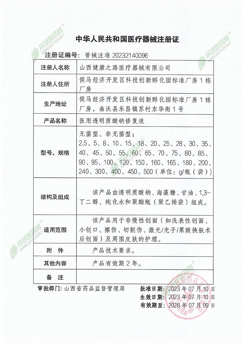 | 補充說明 | 【產(chǎn)品名稱】醫(yī)用透明質(zhì)酸鈉修復(fù)液 【型號、規(guī)格】 型號:無菌型、非無菌型; 規(guī)格:2.5g、5g、8g、10g、15g、18g、20g、25g、28g、30g、35g、40g、45g、50g、55g、60g、65g、70g、75g、80g、85g、90g、95g、100g、120g、150g、160g、165g、180g、200g、240g、300g、400g、450g、500g/瓶(袋)。 【結(jié)構(gòu)及組成】 該產(chǎn)品由透明質(zhì)酸鈉、海藻糖、甘油、1,3-丁二醇、純化水和聚酯瓶(聚乙烯袋)組成。 【產(chǎn)品性能】pH值范圍為5.0-7.5。 【適用范圍】該產(chǎn)品用于非慢性創(chuàng)面(如淺表性創(chuàng)面、小創(chuàng)口、擦傷、切割傷、激光/光子/果酸換膚術(shù)后創(chuàng)面)及周圍皮膚的護理。 【使用方法】外用。清潔患處皮膚,取本品外敷于患處。 【禁 忌 癥】 1、對外用透明質(zhì)酸鈉類制品,以及本品成分過敏者禁用。 2、痤瘡合并嚴重感染和膿皰者在炎癥未得到有效控制前不得使用。 3、本產(chǎn)品在醫(yī)生指導下應(yīng)用于開放性傷口及燒、燙傷,如出現(xiàn)不適,請立即停止使用或遵醫(yī)囑。 4、嬰幼兒、孕婦慎用。 【注意事項】 (1)本品較少出現(xiàn)過敏反應(yīng),一旦出現(xiàn)過敏反應(yīng),應(yīng)停用本品。 (2)本品僅供外用,不得內(nèi)服。 (3)本品經(jīng)滅菌處理,使用前確認包裝是否完整,如遇破損,切勿使用。 (4)切勿直接接觸眼睛,如接觸眼睛,請用大量清水沖洗。 (5)本品性狀發(fā)生改變時禁止使用。 (6)使用前請閱讀說明書,在產(chǎn)品有效期內(nèi)使用,超過有效期禁止使用。 (7)使用后的產(chǎn)品按照醫(yī)院規(guī)定或環(huán)保要求處理。 (8)開封后30天內(nèi)使用。 【儲存方法】應(yīng)貯存在陰涼干燥處,避免陽光直射。 【運輸】產(chǎn)品在運輸過程中應(yīng)避免日曬、雨淋及重壓。 【配件清單】醫(yī)用透明質(zhì)酸鈉修復(fù)液、說明書 【有效期】二年 【生產(chǎn)日期/生產(chǎn)批號/滅菌批號】見外包裝 【醫(yī)療器械生產(chǎn)許可證編號】晉藥監(jiān)械生產(chǎn)許20200012號 【醫(yī)療器械注冊證編號】晉械注準20232140096 【醫(yī)療器械產(chǎn)品技術(shù)要求編號】晉械注準20232140096 【注冊人名稱/生產(chǎn)企業(yè)】山西健康之路醫(yī)療器械有限公司 【注冊人住所/生產(chǎn)企業(yè)住所】侯馬經(jīng)濟開發(fā)區(qū)科技創(chuàng)新孵化園標準廠房1棟廠房 【生產(chǎn)地址】侯馬經(jīng)濟開發(fā)區(qū)科技創(chuàng)新孵化園標準廠房1棟廠房,曲沃縣樂昌鎮(zhèn)蘇村東華街1號 |
