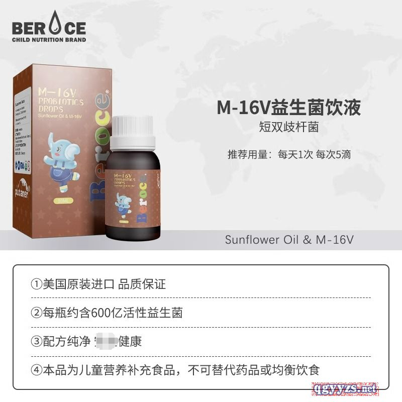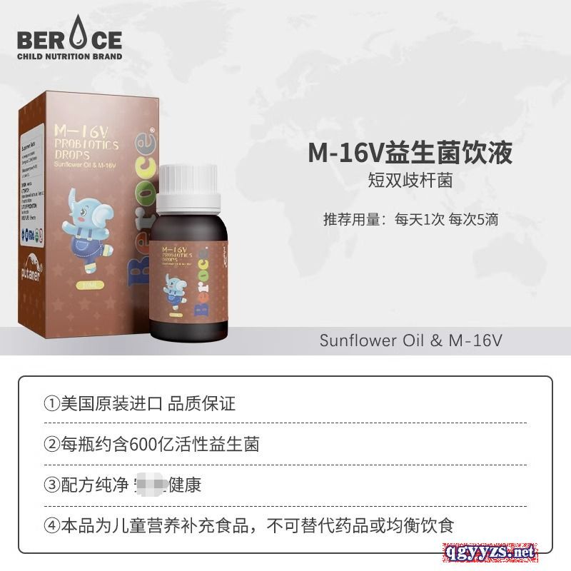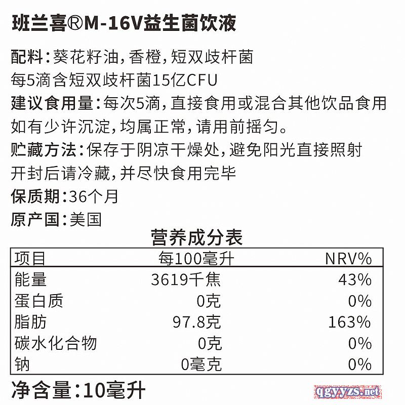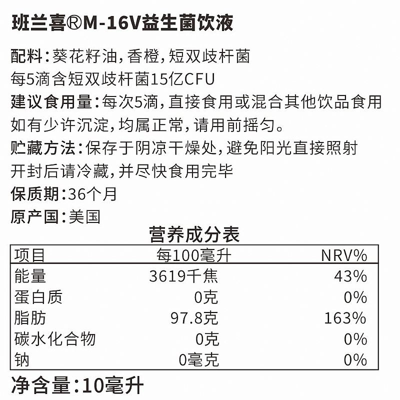 | 補充說明 | M-16V益生菌飲液 配料:葵花籽油,香橙,短雙歧桿菌 每5滴含短雙歧桿菌15億CFU 建議食用量:每次5滴,直接食用或混合其他飲品食用 如有少許沉淀,均屬正常,請用前搖勻。 貯藏方法:保存于陰涼干燥處,避免陽光直接照射 開封后請冷藏,并盡快食用完畢 保質(zhì)期:36個月 原產(chǎn)國:美國 |