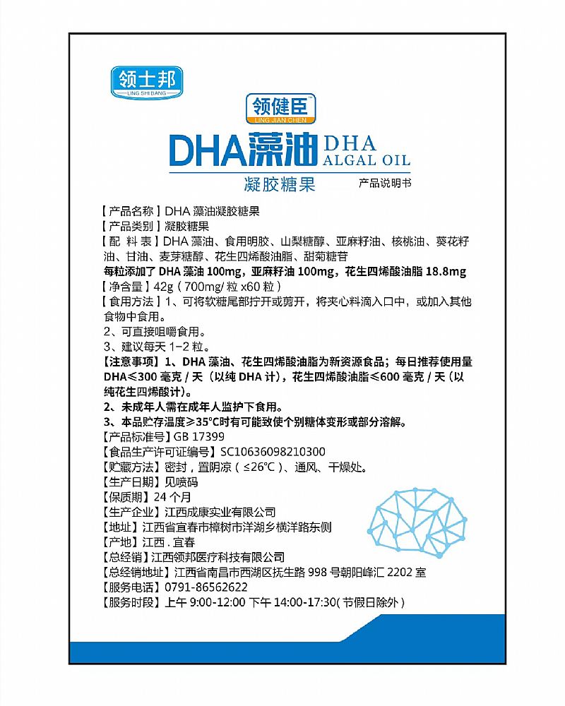 | 主要成分 | DHA藻油、亞麻籽油、核桃油、葵花籽油、麥芽糖醇、花生四烯酸油脂。 |