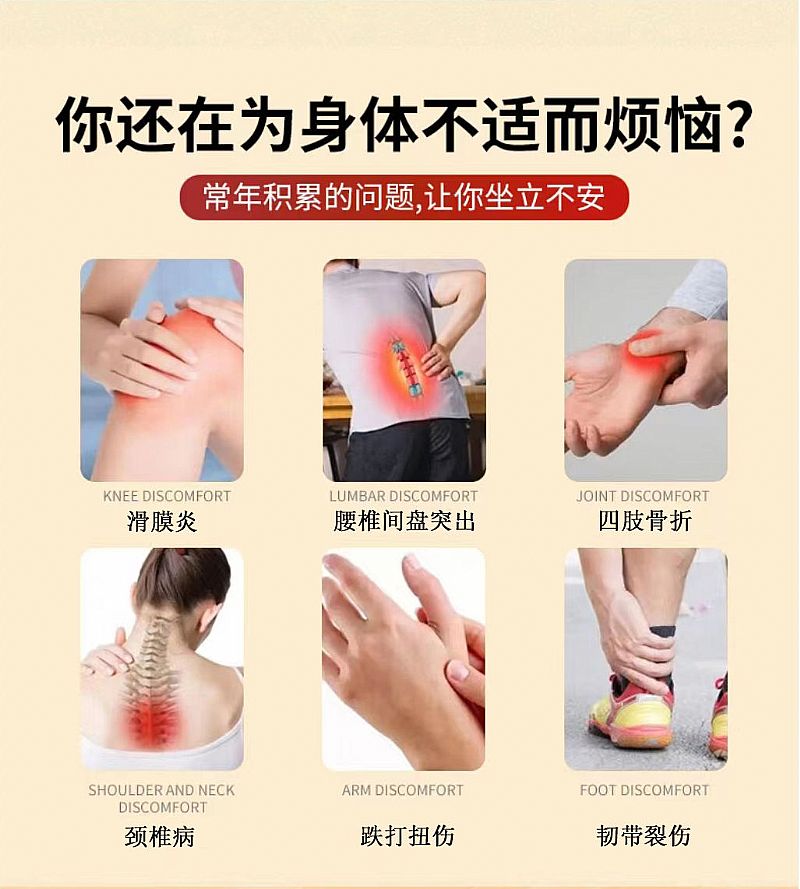 | 產(chǎn)品用途 | 適宜于緩解因跌打扭傷、腰痛、膝蓋痛、滑膜炎、韌帶拉傷、穩(wěn)定型骨折、骨裂、骨不連、肩周炎、頸椎、腳踝等不適的亞健康人群,促進(jìn)健康。 |