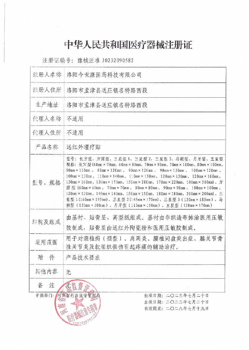 | 補(bǔ)充說(shuō)明 | 【產(chǎn)品名稱]遠(yuǎn)紅外理療貼 【結(jié)構(gòu)組成]由基襯、貼膏層、離型紙組成;r由非織造布攤涂醫(yī)用壓敏膠制成,貼膏層由遠(yuǎn)紅外陶瓷粉和醫(yī)用壓敏膠制成。 [適用范圍]用于對(duì)頸椎病(頸型)、肩周炎、腰椎間盤突出癥、膝關(guān)節(jié)骨性關(guān)節(jié)炎及軟組織損傷引起疼痛的輔助治療。 【產(chǎn)品性能]1.外觀:遠(yuǎn)紅外理療貼周邊剪裁整齊,不得有毛邊,基襯無(wú)滲漏,基質(zhì)應(yīng)為類白色至淡棕黃色,膏面雜以黑色斑點(diǎn),無(wú)異味。2.遠(yuǎn)紅外理療貼尺寸:遠(yuǎn)紅外理療貼尺寸應(yīng)符合表1的要求。3.非織造布:基襯所用非織造布規(guī)格不少于40g/㎡。4.紅外波: 遠(yuǎn)紅外線波長(zhǎng)在8μm~15μm范圍內(nèi)的法向發(fā)射率不小于85%。5.離型紙:離型紙規(guī)格不少于80g/㎡。6.持粘性:遠(yuǎn)紅外理療貼的持粘性應(yīng)不大于2.5mm。7.剝離強(qiáng)度:基襯的剝離強(qiáng)度應(yīng)不小于1.0N/cm。 【使用方法]:清潔患處,取出貼劑揭開(kāi)防粘層,將膠面貼于患處,輕輕按壓即可,24小時(shí)可更換一次,10次為一個(gè)療程。使用時(shí)或遵醫(yī)囑。 [禁忌癥]1.皮膚紅腫、潰爛、破損者禁用;2.過(guò)敏體質(zhì)者忌用;3.孕婦慎用;4.裝有心臟起搏器、出血傾向性疾病者禁用;5.發(fā)熱、活動(dòng)性結(jié)核、惡性腫瘤、局部皮膚感覺(jué)障礙、感染者禁用;6.兒童禁用,糖尿病者禁用;7.對(duì)橡膠有過(guò)敏史者禁用;8.合并有心腦血管、肝、腎和造血系統(tǒng)等嚴(yán)重原發(fā)性疾病者禁用;9.精神病患者禁用。 【注意事項(xiàng)、警示及提示性說(shuō)明】1.本品為外用貼劑,一次性使用,禁止重復(fù)使用;2.對(duì)包裝標(biāo)志、生產(chǎn)日期、有效期進(jìn)行確認(rèn),并在有效期內(nèi)使用。3.極少數(shù)人有皮膚輕度過(guò)敏反應(yīng),停用即愈;如有嚴(yán)重過(guò)敏反應(yīng),立即停用,必要時(shí)到醫(yī)院就診。4.使用后的產(chǎn)品按不可隨意丟棄,應(yīng)按照《醫(yī)療廢物管理?xiàng)l例》的要求銷毀。5.請(qǐng)將本品放到兒童不能接觸到的地方。 |