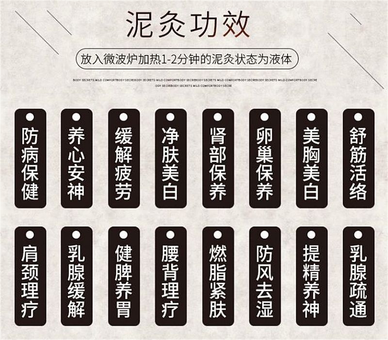 | 產(chǎn)品賣點 | 泥灸是一種在人體特定部位通過用泥藥熱灼和熨燙刺激,其涵義是熱灼和熨燙 |