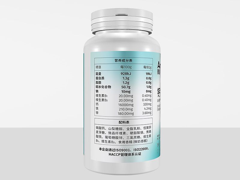 | 主要成分 | 碳酸鈣、山梨糖醇、全脂乳粉、低聚異麥芽糖、微晶纖維素、硬脂酸鎂、焦磷酸鐵、葡萄糖酸鋅、三氯蔗糖、維生素B1、維生素B2、食用香精(鮮奶香精) |