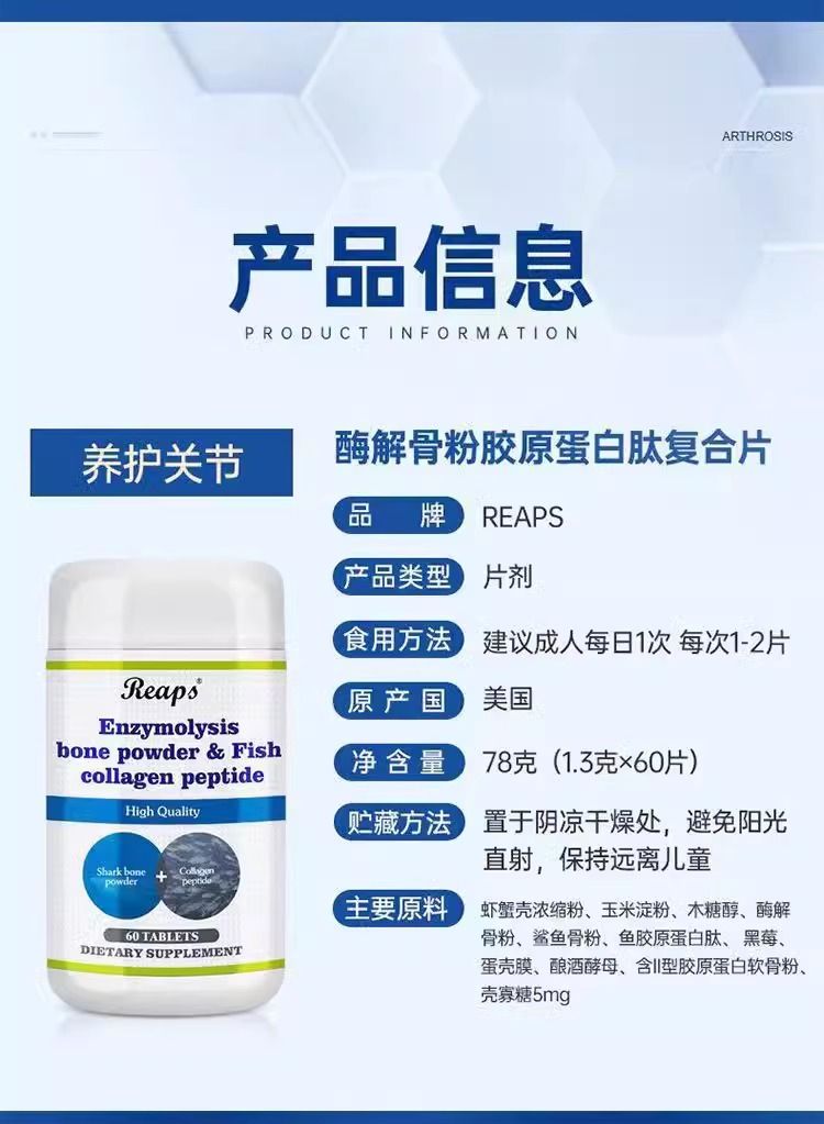 | 補充說明 | 產品名稱:乳礦物質鹽(氨糖) 主要成分:木糖,松子,礦物牛奶,初乳蛋白質,水解膠原蛋白,硬脂酸鎂,食用香精;每片含松子濃縮粉(含氨糖)500mg,乳礦物鹽200mg,初乳堿性蛋白100mg 產品規(guī)格:60片/瓶 食用方法:建議成人每日1次,每次1片。 適用人群:成年人及中老年缺鈣人群 儲存方法:陰涼干燥處保存。 保質期:4年 |