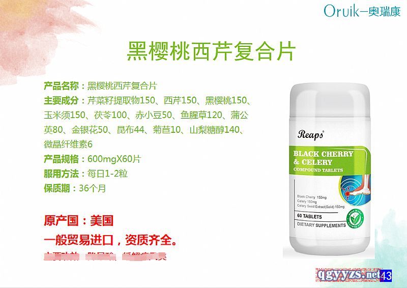 | 補(bǔ)充說(shuō)明 | 產(chǎn)品名稱:黑櫻桃西芹復(fù)合片 主要成分:芹菜籽提取物150、西芹150、黑櫻桃150、玉米須150、茯苓100、赤小豆50、魚(yú)腥草120、蒲公英80、金銀花50、昆布44、菊苣10、山梨糖醇140、微晶纖維素6 產(chǎn)品規(guī)格:600mgX60片 服用方法:每日1-2粒 保質(zhì)期:36個(gè)月 |