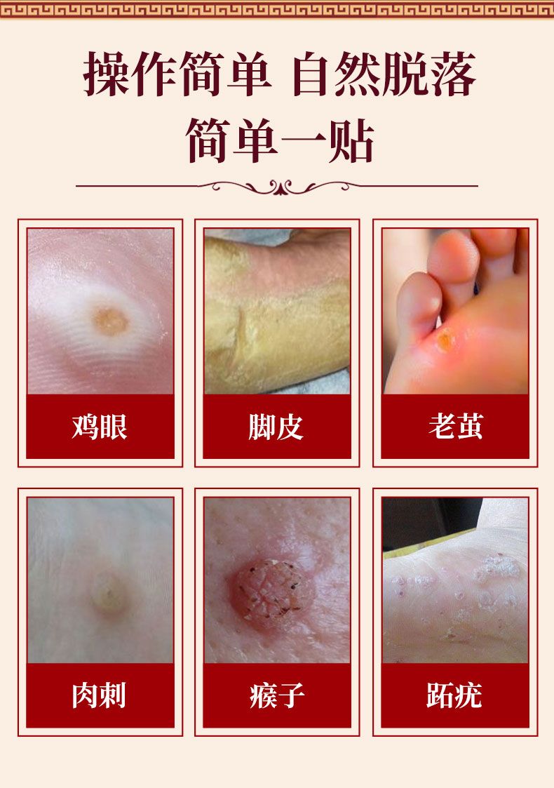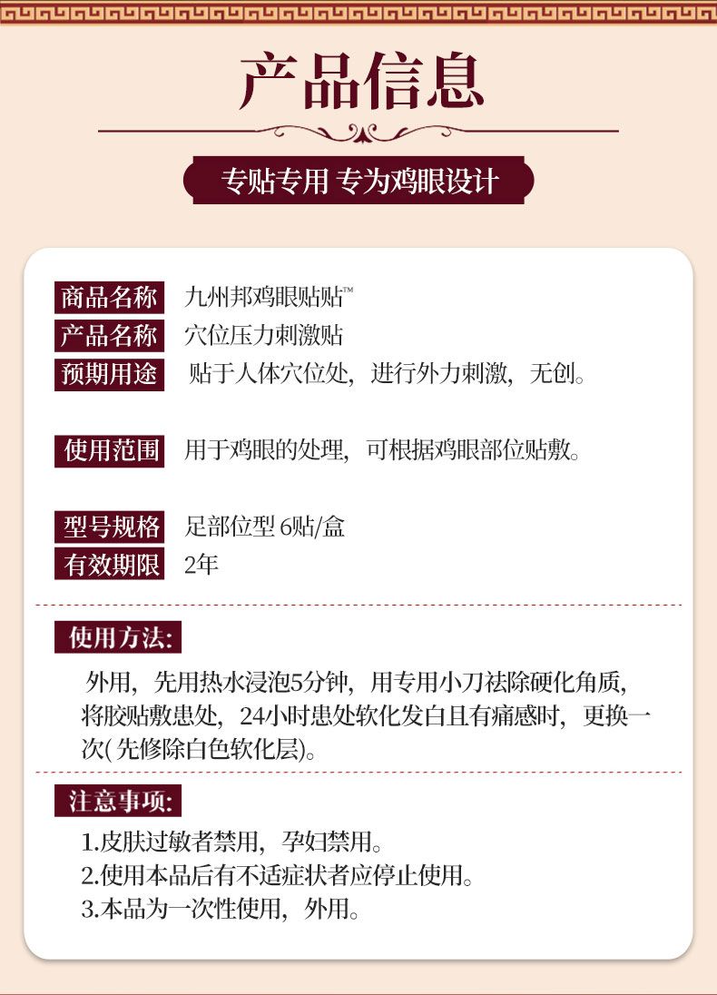 | 使用方法 | 外用,使用本品前將患處用熱水浸洗十分鐘,拭干后將雞眼貼蓋膜撕去后敷于雞眼處,24小時后,如患處軟化發(fā)白,略感痛疼時,可更換一次(宜先修除白色軟化層)。若未發(fā)現(xiàn)上述現(xiàn)象可延長貼用時間。 |