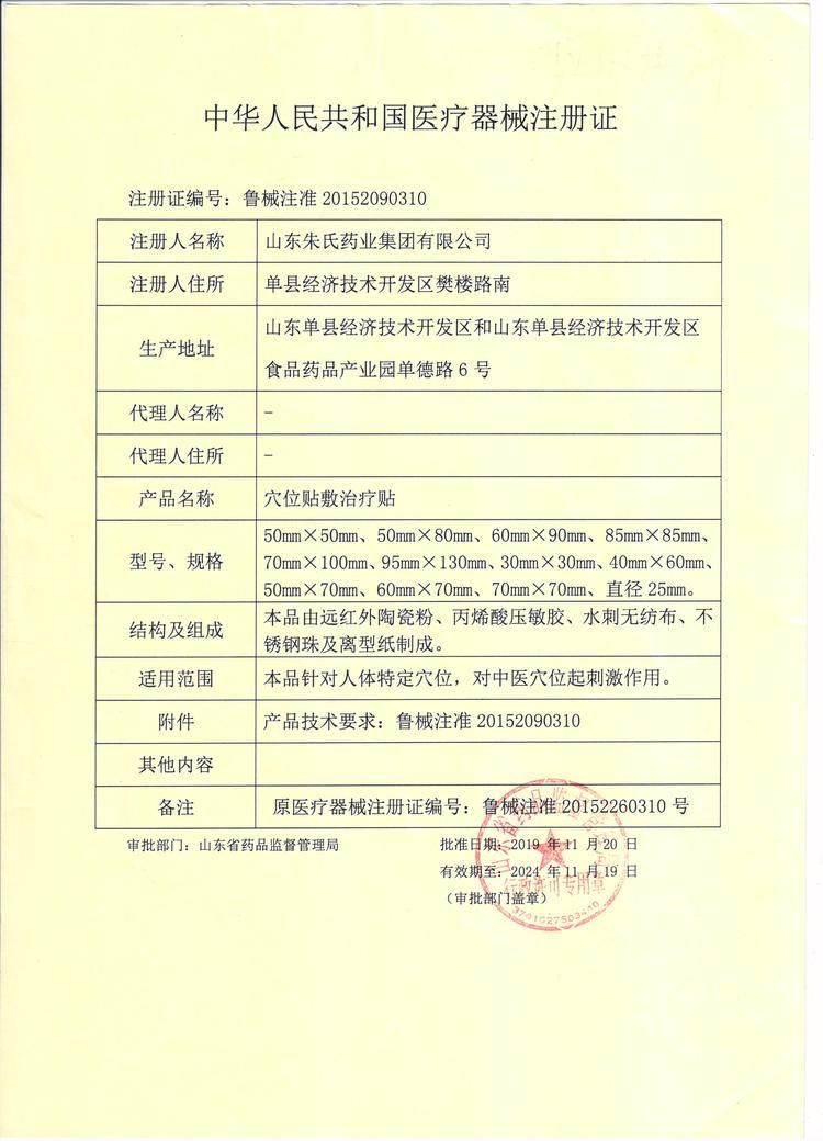 | 補(bǔ)充說(shuō)明 | 詳見(jiàn)說(shuō)明書(shū)秦魯藥業(yè)穴位貼敷治療貼小兒便秘貼牌定制代理代加工 【生產(chǎn)許可證】魯食藥監(jiān)械生產(chǎn)許20140053號(hào) 【產(chǎn)品技術(shù)要求】魯械注準(zhǔn)20152260310 【規(guī) 格】7cm×10cm×3貼×2袋 【生產(chǎn)單位】山東朱氏藥業(yè)集團(tuán)有限公司 【生產(chǎn)地址】山東菏澤單縣經(jīng)濟(jì)技術(shù)開(kāi)發(fā)區(qū) 其它說(shuō)明 請(qǐng)勿留言,不然您的手機(jī)會(huì)被打爆,電話聯(lián)系:18661593511 |
