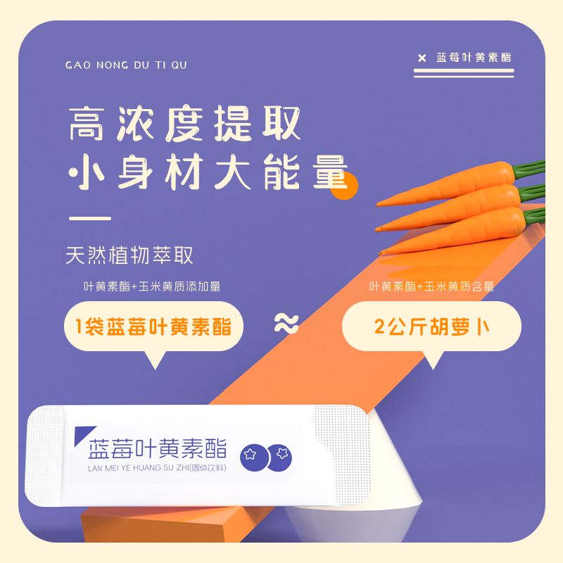 | 補充說明 | 產品:藍莓葉黃素脂 規(guī)格:4g*10袋/盒*100盒/件 用法:1袋/次/天,溫水沖服。 效期:24個月 控銷產品 提供學術支持 成份: 藍莓果粉、葉黃素酯微囊粉、亞麻籽油微囊粉、(3R,3'R)- 二羥基-β-胡蘿卜素、復合維生素(維生素B6、維生素B12、葉酸、煙酸、泛酸、;撬)、透明質酸鈉、低聚異麥芽糖、脫脂乳粉。 含量: 葉黃素酯食用量 ≤ 12mg/天, 葉黃素酯粉(含10%葉黃素酯)添加量 120mg/袋; 玉米黃質 = (3R,3'R)- 二羥基-β-胡蘿卜素 玉米黃質食用量 ≤ 4mg/天, 玉米黃質添加量 = 2.4mg/袋。 |