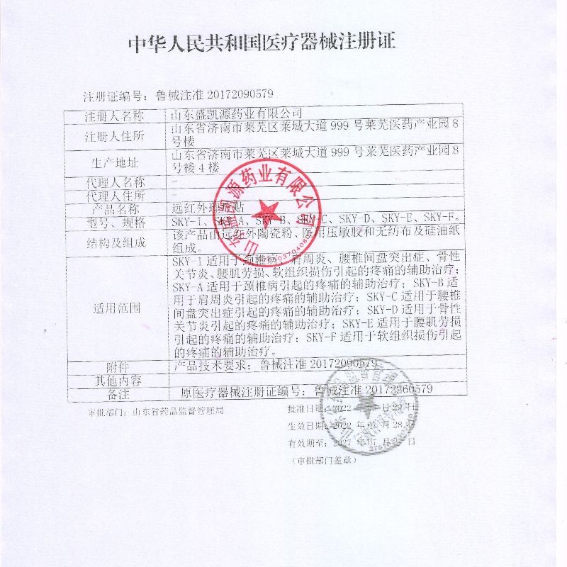| 補(bǔ)充說明 | 【產(chǎn)品名稱】遠(yuǎn)紅外理療貼 【產(chǎn)品型號(hào)】SKY-I 【結(jié)構(gòu)及組成】 遠(yuǎn)紅外理療貼由遠(yuǎn)紅外陶瓷粉、醫(yī)用壓敏膠和無紡布及硅油紙組成。 1、剝離強(qiáng)度不低于1.0 N/cm。 2、持粘性不大于2.5 mm。 3、粘膠層在溫度37℃條件下放置30min后應(yīng)無殘留粘性物質(zhì)。 4、遠(yuǎn)紅外發(fā)射波長范圍:8~15um。 5、法向比輻射率不低于80%。 【適用范圍】 適用于頸椎病、肩周炎、腰椎間盤突出癥、骨性關(guān)節(jié)炎、腰肌勞損、軟組織損傷引起的疼痛的輔助治療。 【使用方法】 清潔患處,取出貼劑揭開防粘層,將膠面貼于患處,輕輕按壓即可,每 24 小時(shí)更換一次, 5 盒為一個(gè)療程。使用時(shí)或遵醫(yī)囑。 【注意事項(xiàng)】 ( 1 )當(dāng)貼敷無效時(shí),及時(shí)到醫(yī)院就診; ( 2 )治療時(shí)若發(fā)現(xiàn)有皮膚連續(xù)或嚴(yán)重過敏現(xiàn)象,應(yīng)停止使用。 【禁 忌 癥】 孕婦禁用;局部皮膚破損,急慢性化膿性炎癥者,出血傾向者禁用。 【貯 存】密封、置常溫干燥處保存。 【規(guī) 格】7cm×10cm 【有 效 期】兩年。 【生產(chǎn)企業(yè)許可證號(hào)】魯食藥監(jiān)械生產(chǎn)許 20120087 號(hào) 【產(chǎn)品技術(shù)要求編號(hào)】魯械注準(zhǔn) 20172260579 【注冊證編號(hào)】魯械注準(zhǔn) 20172260579 更多 舒源穴位敷貼 遠(yuǎn)紅外理療貼 |