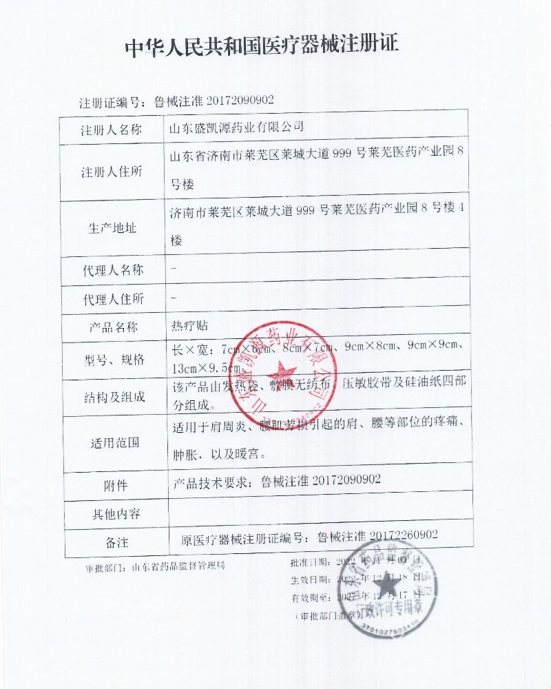 | 補(bǔ)充說(shuō)明 | 【產(chǎn)品名稱(chēng)】熱療貼 【結(jié)構(gòu)性能】本品由發(fā)熱袋、敷膜無(wú)紡布、壓敏膠帶及硅油紙四部分組成。 1、升溫時(shí)間:熱療貼升溫至 40 ℃,時(shí)間不超過(guò) 10min 。 2、持續(xù)時(shí)間: 40 ℃以上持續(xù)時(shí)間不少于8h。 3、溫度**時(shí)間:應(yīng)大于持續(xù)時(shí)間的 40% 。 【適用范圍】適用于暖宮。 【使用方法】撕開(kāi)包裝材料袋,取出熱療貼,揭下硅油紙,根據(jù)臨床雷火灸法、隔物灸法或者燙熨治療原理,將膠面貼敷于患處或病灶穴位處。每天 1 貼,每貼使用不超過(guò) 12 小時(shí), 6 天一個(gè)療程。 【注意事項(xiàng)】外用,使用時(shí)若感到過(guò)熱,可適當(dāng)加溫控貼。有皮膚感覺(jué)障礙者慎用,不要直接粘貼在皮膚上。防止低溫燙傷。僅為一次性使用。 【禁 忌 癥 】皮膚病、糖尿病、急性期炎癥患者、皮膚潰爛處、孕婦下腹部、皮膚破損、化膿性感染、發(fā)熱者、腫瘤患者禁用。 【貯 存】密閉、避光、防曬。 【有效期 】?jī)赡辍?br> 【生產(chǎn)企業(yè)許可證號(hào)】魯食藥監(jiān)械生產(chǎn)許 20120087 號(hào) 【產(chǎn)品技術(shù)要求編號(hào)】魯械注準(zhǔn) 20172260902 【注冊(cè)證編號(hào)】魯械注準(zhǔn) 20172260902 【規(guī) 格】7cm×6cm 8cm×7cm 9cm×8cm 9cm×9cm 13cm×9.5cm 更多 暖宮貼 |