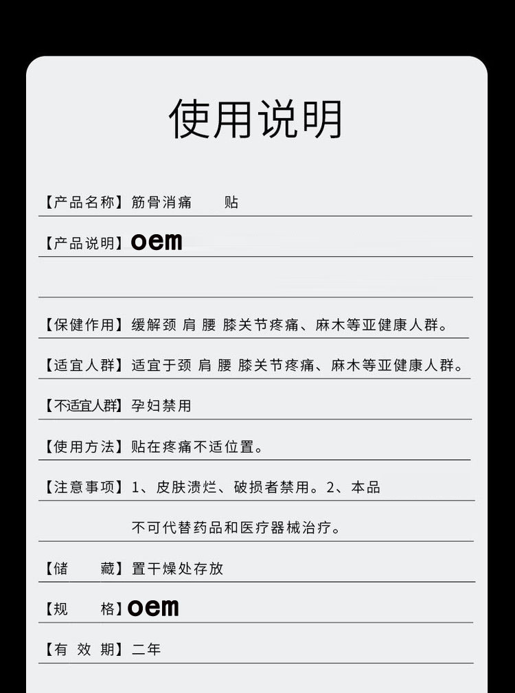 | 產(chǎn)品賣點 | 防水黑膏貼/筋骨貼/筋骨消痛貼/oem貼牌代加工 |