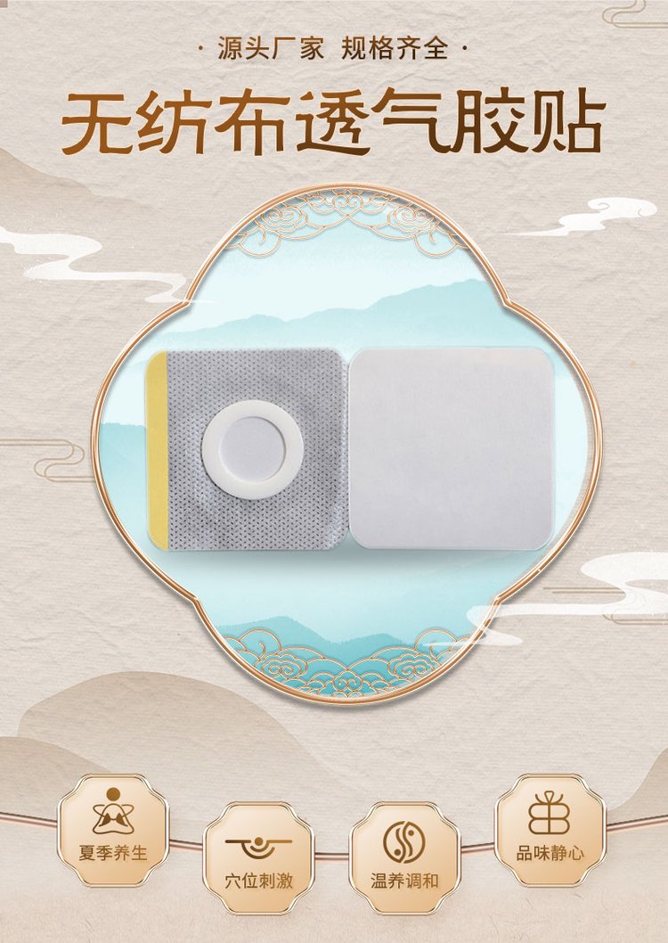 | 補充說明 | 更多 無紡布透氣膠貼三伏貼穴位貼直供直發(fā)醫(yī)院藥店診所oem貼牌代加工中標產(chǎn)品 是 產(chǎn)品用途 本品針對人體特定穴位,對中醫(yī)穴位起刺激作用。 主要成分 本品由遠紅外陶瓷粉、丙烯酸壓敏膠、水刺無紡布、不銹鋼珠及離型紙制成。 使用方法 、清潔相應(yīng)穴位,先以拇指依次揉按相應(yīng)穴位,每穴1~2分鐘,范圍由小到大,力量由輕到重,探尋敏感點。2、確認包裝無破損后,打開包裝,取出穴位貼敷治療貼,將貼劑的隔離膜撕去,以鋼珠對準相應(yīng)穴位敏感點貼壓,1片/穴、天,每日適度按壓3~5次,每次3~5分鐘,1個療程為10天,療程間隔2~3天 |