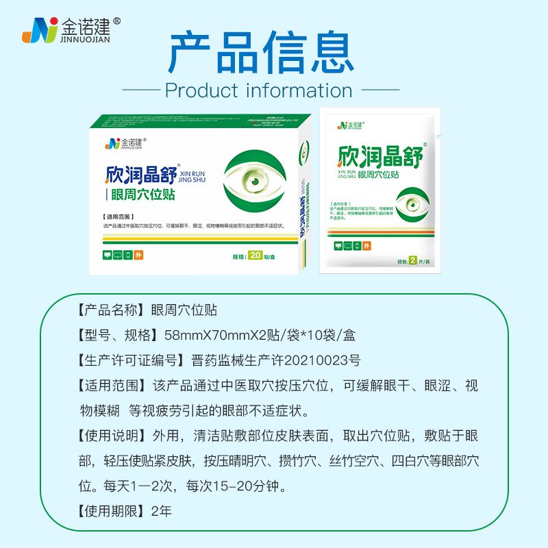 | 補(bǔ)充說明 | 【產(chǎn)品名稱】眼周穴位貼 【型號(hào)、規(guī)格】58mmX70mm/貼X2貼/袋X10袋/盒 【注冊證編號(hào)/產(chǎn)品技術(shù)要求編號(hào)】晉械注準(zhǔn)20242200025 【生產(chǎn)許可證編號(hào)】晉藥監(jiān)械生產(chǎn)許20210023號(hào) 【結(jié)構(gòu)及組成】該產(chǎn)品由卡波姆、依地酸鈉、甘油、透明質(zhì)酸鈉、三乙醇胺、苯氧乙醇、薄荷油(嬌味劑)、純化水和無紡布組成。初包轉(zhuǎn)為純鋁PE級。 【產(chǎn)品性能】pH值(25℃):6.0-8.0;需氧菌數(shù)(CFU/g)≤100,霉菌和酵母菌數(shù)(CFU/g)≤100,金黃色葡萄球菌、銅綠假單胞菌,大腸埃希菌(g)不得有檢出。 【適用范圍】該產(chǎn)品通過中醫(yī)取穴按壓穴位,可緩解眼干、眼澀、視物模糊等視疲勞引起的眼部不適癥狀。 【使用說明】外用,清潔貼敷部位皮膚表面,取出穴位貼,敷貼于眼部,輕壓使貼緊皮膚,按壓晴明穴、攢竹穴、絲竹空穴、四白穴等眼部穴位。每天1一2次,每次15-20分鐘。 【禁忌癥】1.對產(chǎn)品成分過敏者禁用;(其他內(nèi)容詳見說明書) 【注意事項(xiàng)】1.勿貼于眼部有創(chuàng)面或者病理性皮膚、敏感性皮膚。(其他內(nèi)容詳見說明書) 【貯存/運(yùn)輸條件】常溫、干燥處。 【使用期限】2年 |