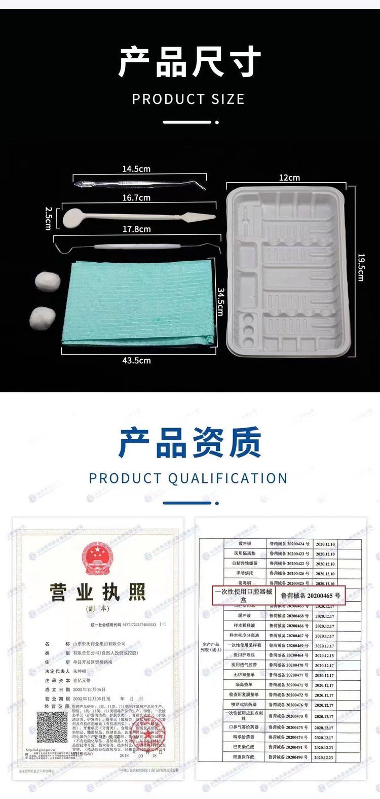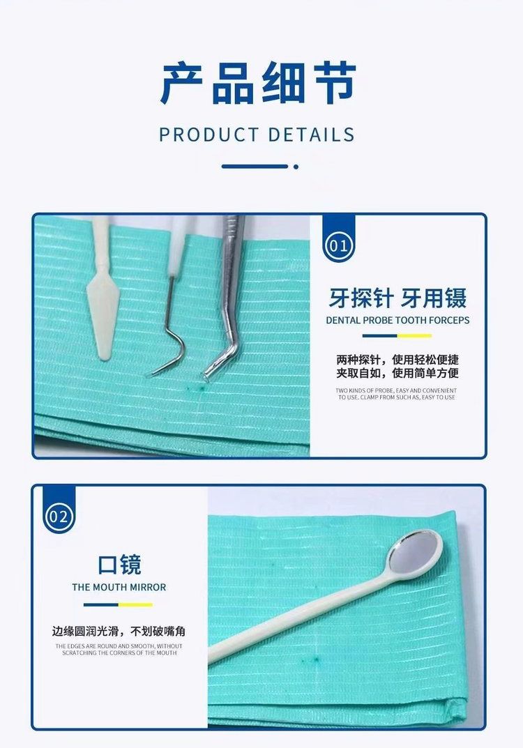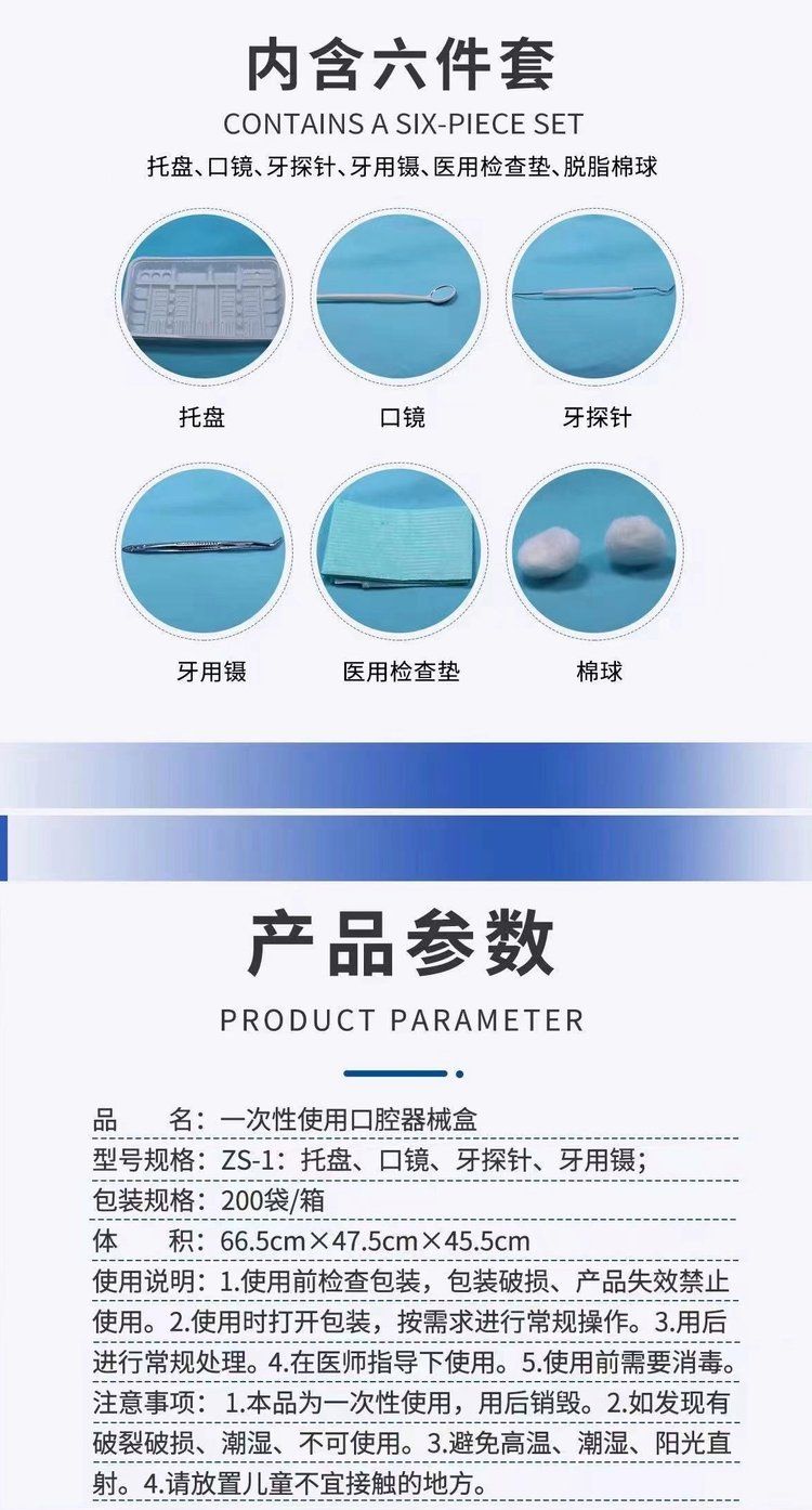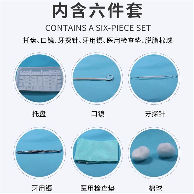 | 主要成分 | 通常由托盤(pán)、口鏡、牙探針、牙用鑷、醫(yī)用檢查墊、脫脂棉球、檢查手套、吸唾管、水槍頭組成,非無(wú)菌提供,一次性使用。 |