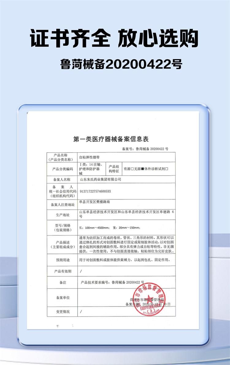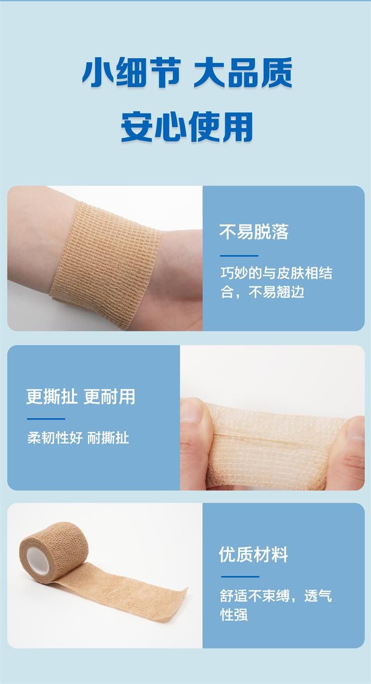 | 補(bǔ)充說(shuō)明 | 【注意事項(xiàng)】1、自粘彈性繃帶雖然有彈性,但是要注意不能包裹太緊,否則可能會(huì)影響到身體的血液流動(dòng),造成不利影響;2、繃帶不能長(zhǎng)時(shí)間包扎使用,購(gòu)買時(shí)詢問(wèn)醫(yī)務(wù)人員,遵守醫(yī)囑;3、如果在使用彈性繃帶的過(guò)程中有出現(xiàn)肢體上的麻木、刺痛,或者是肢體出現(xiàn)意外的變冷變得蒼白等,立即取下繃帶,同時(shí)注意觀察綁扎區(qū)域的情況;4、注意繃帶的彈性,彈性繃帶如果沒(méi)有了彈性,效果會(huì)相對(duì)差一些,同時(shí)也要注意彈性繃帶的情況,不要弄濕或者弄臟。5、禁止接近高溫發(fā)熱、有腐蝕性的物體;6、禁止接近明火;7、禁止雨淋、曝曬;8、禁止隨意丟棄;9、一次性使用。 |