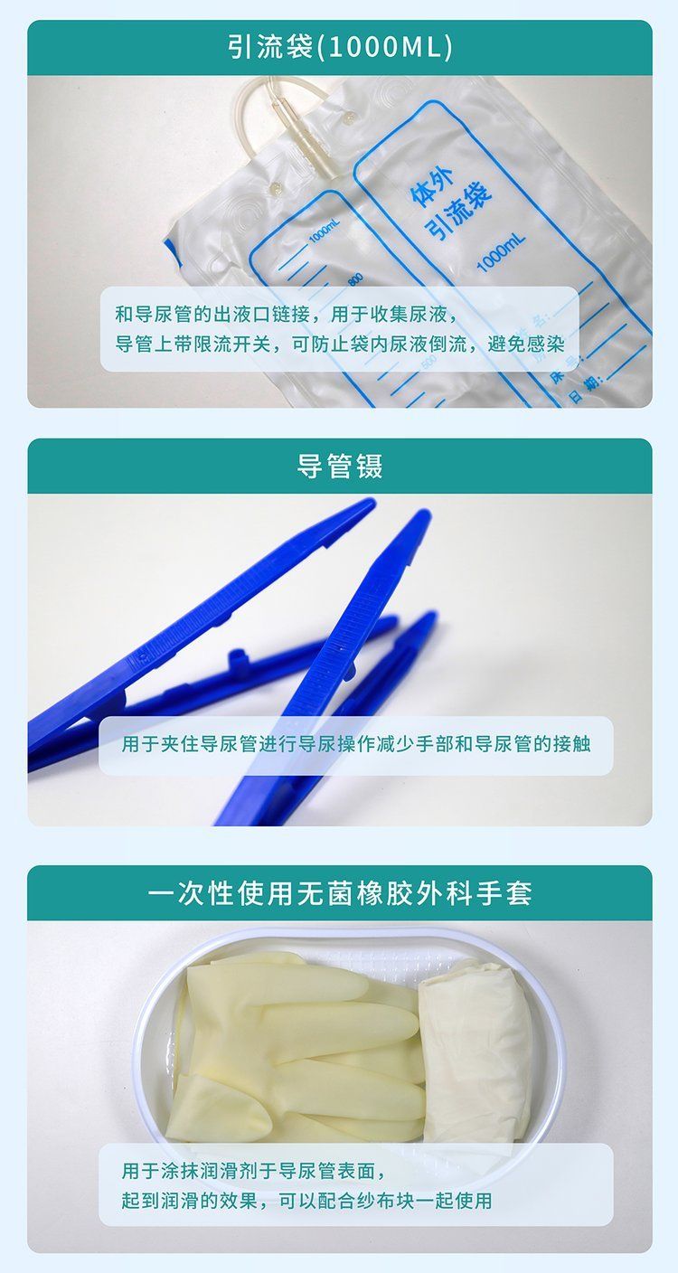 | 使用方法 | 1、根據(jù)患者體型不同選用合適規(guī)格的導(dǎo)尿管。 2、從開啟口打開包裝,取出導(dǎo)尿管,操作人員手部和患者使用部位應(yīng)進行常規(guī)消毒,操作人員應(yīng)戴好手套。 3、為便于導(dǎo)尿管插入,導(dǎo)尿管尖端及管身可用醫(yī)用液體石蠟或其他合適的潤滑劑潤滑 4、導(dǎo)尿管插入后,應(yīng)用膠帶等合適方法加以固定,防止脫落滑出體外,患者引流部位用滅菌紗布遮蓋,防止外界環(huán)境污染。 5、導(dǎo)尿管與引流導(dǎo)管連接,通過流量調(diào)節(jié)裝置控制流量 |