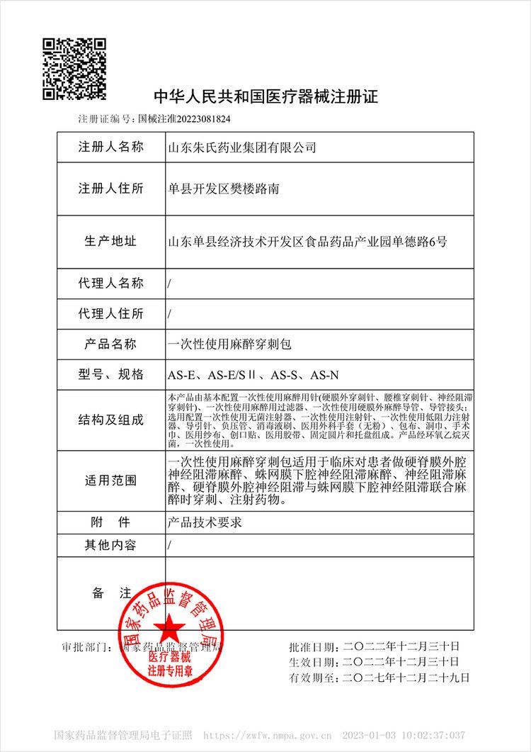 | 產(chǎn)品用途 | 一次性使用麻醉穿刺包適用于臨床對患者做硬脊膜外腔神經(jīng)阻滯麻醉、蛛網(wǎng)膜下腔神經(jīng)阻滯麻醉、神經(jīng)阻滯麻醉、硬脊膜外腔神經(jīng)阻滯與蛛網(wǎng)膜下腔神經(jīng)阻滯聯(lián)合麻醉時穿刺、注射藥物。 |