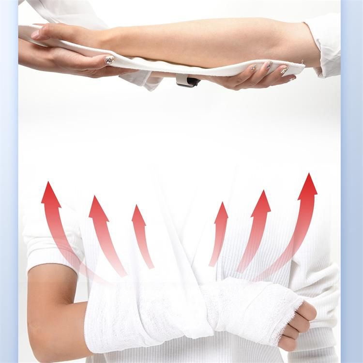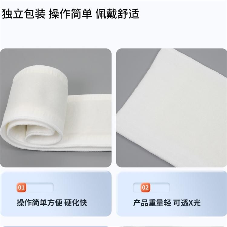 | 使用方法 | 1、根據(jù)不同的部位選擇適當尺寸的夾板; 2、打開包裝,將夾板放在常溫水中浸泡5-6秒同時擠壓2~3次,取出后擠去多余水分; 3、依實際需要,對夾板進行塑形修剪。固化時間3~5分鐘,并用普通紗布繃帶或彈力繃帶纏繞固定,20分鐘后即可完全承重; 4、剪開紗布繃帶或彈力繃帶即可拆除。 |