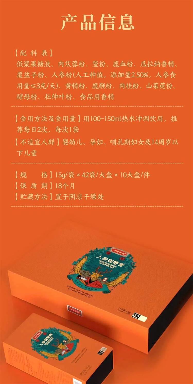 | 補(bǔ)充說明 | [配料表]低聚果糖液、肉蓯蓉粉、鱉粉、鹿血粉、瓜拉納香精、覆盆子粉、人參粉(人工種植,添加量2.50%,人參食用量≤3克/天)、黃精粉、鹿鞭粉、肉桂粉、山茱萸粉、酵母粉、杜仲葉粉、食品用香精 [食用方法及食用量]用100-150ml熱水沖調(diào)飲用,推薦每日2次,每次1袋 [不適宜人群]嬰幼兒、孕婦、哺乳期婦女及14周歲以下兒童 [規(guī)格]15g/袋x42袋/大盒x10大盒/件 [保質(zhì)期] 18個(gè)月 [貯藏方法)置于陰涼干燥處 |