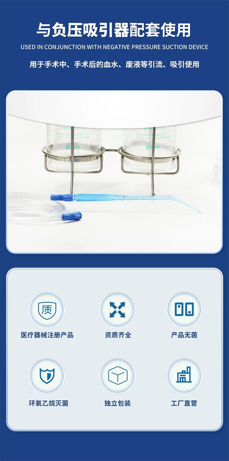 | 產(chǎn)品用途 | 與負壓吸引器配套使用,用于手術中、手術后的血水、廢液等引流、吸引使用。 |
