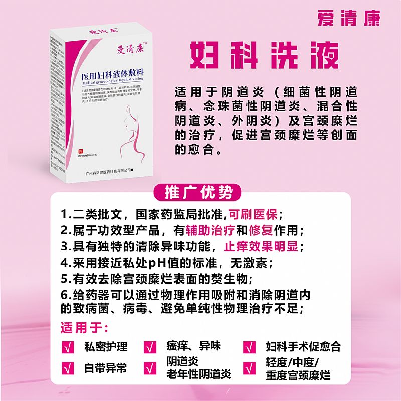 | 產(chǎn)品賣點(diǎn) | 婦科HPV洗液、陰道炎宮頸炎治療、正規(guī)二類器械批文、適應(yīng)癥明確、一區(qū)一碼,嚴(yán)格控銷、適用范圍清晰。 1.二類批文,國(guó)家藥監(jiān)局批準(zhǔn),可刷醫(yī)保; 2.屬于功效型產(chǎn)品,有輔助治療和修復(fù)作用; 3.具有獨(dú)特的清除異味功能,止癢效果明顯; 4.采用接近私處pH值的標(biāo)準(zhǔn),無激素; 6.給藥器可以通過物理作用; |