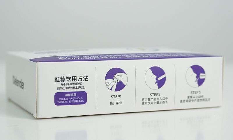| 食用方法 | 餐前15分鐘飲用,每日2次,建議午餐、晚餐前 Step1 撕開條袋 Step2 將少量產(chǎn)品倒入口中隨即飲用少量水吞下 Step3 重復(fù)以上動(dòng)作,少量多次,直至將產(chǎn)品飲用完畢 (所有步驟總水量約400ML) |