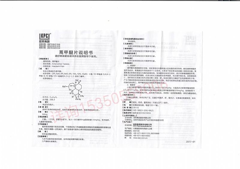 | 補充說明 | 成分 本品主要成份為蒿甲醚。 性狀 本品為白色片。 適應(yīng)癥 適用于各類瘧疾的治療,包括抗氯喹惡性瘧的治療,如惡性瘧和間日瘧。 規(guī)格 (1)40mg;(2)50mg。 用法用量 口服。一日1次,連服5天或7天,成人一次口服80mg或按體重1.6mg/kg,首次加倍,兒童按年齡遞減。 不良反應(yīng) 臨床使用劑量不良反應(yīng)輕微,個別患者有門冬氨酸氨基轉(zhuǎn)移酶和丙氨酸氨基轉(zhuǎn)移酶輕度升高,網(wǎng)織紅細(xì)胞一過性減少。極個別患者可能有心律失常(如室性期前收縮等)。 禁忌 對本品過敏者禁用。 注意事項 1、對于兇險型瘧疾的急救,應(yīng)考慮使用蒿甲醚注射液。 2、嚴(yán)重嘔吐者慎用。 藥物相互作用 如與其他藥物同時使用可能會發(fā)生藥物相互作用,詳情請咨詢醫(yī)師或藥師。 藥理作用 蒿甲醚為青蒿素的衍生物,對瘧原蟲紅內(nèi)期有強大且快速的殺滅作用,能迅速控制臨床發(fā)作及癥狀。青蒿素的作用機制尚不十分清楚,主要是干擾瘧原蟲的表膜—線粒體功能。青蒿素通過影響瘧原蟲紅內(nèi)期的超微結(jié)構(gòu),使其膜系結(jié)構(gòu)發(fā)生變化。由于對食物泡膜的作用,阻斷了瘧原蟲的營養(yǎng)攝取,瘧原蟲損失大量胞漿和營養(yǎng)物質(zhì),而又得不到補充,因而很快死亡。其作用方式是通過其內(nèi)過氧化物(雙氧)橋,經(jīng)血紅蛋白分解后產(chǎn)生的游離鐵所介導(dǎo),產(chǎn)生不穩(wěn)定的有機自由基及/或其他親電子的中介物,然后與瘧原蟲的蛋白質(zhì)形成共價加合物,而使瘧原蟲死亡。蒿甲醚的抗瘧活性較青蒿素大6倍。 毒理作用 小鼠口服蒿甲醚的半數(shù)致死量(LD50)為895-977mg/kg,大鼠肌內(nèi)注射蒿甲醚油劑的LD50為597mg/kg。亞急性毒性試驗表明大鼠肌注蒿甲醚油劑每天18mg/kg,連續(xù)使用14天后,除網(wǎng)織紅細(xì)胞數(shù)減少外,無其他不良反應(yīng)。本藥有一定的胚胎毒性,表現(xiàn)為胚胎吸收。 藥代動力學(xué) 口服后易吸收。體內(nèi)分布廣泛,以腦分布*多,肝、腎次之;主要通過糞便排泄,其次為尿排泄。 貯藏方法 遮光,密封,在陰涼處(不超過20℃)保存。 有效期 36個月 執(zhí)行標(biāo)準(zhǔn) 國家食品藥品監(jiān)督管理局國家藥品標(biāo)準(zhǔn)WS1-(X-077)-2011Z。 鑒別 1、取本品細(xì)粉適量(約相當(dāng)于蒿甲醚20mg),加無水乙醇20ml使溶解,濾過,取濾液于水浴上揮去2/3溶劑后,取殘留液數(shù)滴點于白瓷板上,加1%香草醛-硫酸溶液1滴,即顯桃紅色。 2、取本品細(xì)粉適量(約相當(dāng)于蒿甲醚100mg),置10ml量瓶中,加氯仿適量,振搖,使篙甲醚溶解并稀釋至刻度,搖勻,濾過,棄去初濾液,取續(xù)濾液作為供試品溶液;另取蒿甲醚對照品適量,加氯仿制成每1ml含蒿甲醚對照品10mg的溶液作為對照品溶液。照薄層色譜法(中國藥典1995年版二部附錄ⅤB)試驗,分別吸取上述兩種溶液各10μl,點于同一硅膠G板上。以石油醚(30-60℃)-醋酸乙酯(7∶3)為展開劑,展開后,取出晾干,在碘蒸氣中顯色,供試品溶液與對照品溶液應(yīng)在相同的位置上顯相同的黃色斑點。 3、取本品細(xì)粉適量(約相當(dāng)于蒿甲醚50mg),加無水乙醇30ml使溶解,濾過,揮干溶劑,取殘渣置試管中,加冰醋酸1ml,苯酚少許,氫碘酸3ml及沸石數(shù)粒,管口用裝有砷鹽檢測法所用帶玻璃管的橡皮塞密塞,玻璃管中裝有醋酸鉛棉花[取醋酸鉛1g,加水10ml使溶解,此液加入到60ml的1mol/L氫氧化鈉溶液中,不斷攪拌,直至沉淀完全溶解,再加甘油1ml,加水至100ml,搖勻,將棉花浸入此溶液后,取出,烘干,即得],長約2cm,在兩塊圓形平板中央夾入一塊用硝酸汞溶液[取水49ml,加硝酸1ml,再加硝酸汞制成飽和溶液]潤濕過的濾紙,將裝好的試管置130-140℃的油浴中,加熱5-10分鐘,濾紙應(yīng)呈朱紅色或橙紅色斑點。 檢查 1、溶出度:取本品,照溶出度測定法(中國藥典1995年版二部附錄ⅩC第二法),以水1000ml為溶劑,轉(zhuǎn)速為每分鐘100轉(zhuǎn),依法操作,經(jīng)60分鐘時,取溶液10ml,濾過,棄去初濾液,精密量取續(xù)濾液5ml于25ml量瓶中,加鹽酸無水乙醇液(1.00±0.01mol/L)[取鹽酸90ml,加無水乙醇至1000ml,搖勻,用氫氧化鈉滴定液(1mol/L)標(biāo)定此鹽酸無水乙醇液的濃度,再調(diào)整為1.00±0.01mol/L]稀釋至刻度,搖勻,密塞,于55±1℃恒溫水浴中保溫5小時(整個量瓶刻度以下都應(yīng)處于保溫環(huán)境中),取出,放冷至室溫,照分光光度法(中國藥典1995年版二部附錄ⅣA)在254nm波長處測定吸收度,按C16H26O5的吸收系數(shù)(E1m)為379計算每片的溶出量,限度為標(biāo)示量的65%,應(yīng)符合規(guī)定。 2、其他:應(yīng)符合片劑項下有關(guān)的各項規(guī)定(中國藥典1995年版二部附錄ⅠA)。 含量測定 取本品10片,精密稱定,研細(xì),精密稱取適量(約相當(dāng)于蒿甲醚13mg),置100ml量瓶中,加無水乙醇溶解并稀釋至刻度,振搖15分鐘,濾過,棄去初濾液,精密量取續(xù)濾液5ml,置50ml量瓶中,加鹽酸無水乙醇液(1.00±0.01mol/L)稀釋至刻度,搖勻,密塞,于55±1℃恒溫水浴中保溫5小時(整個量瓶刻度以下都應(yīng)處于保溫環(huán)境中),取出,放冷至室溫,照分光光度法(中國藥典1995年版二部附錄ⅣA)在254nm波長處測定吸收度,按C16H26O5的吸收系數(shù)(E1m)為379計算,即得。 |