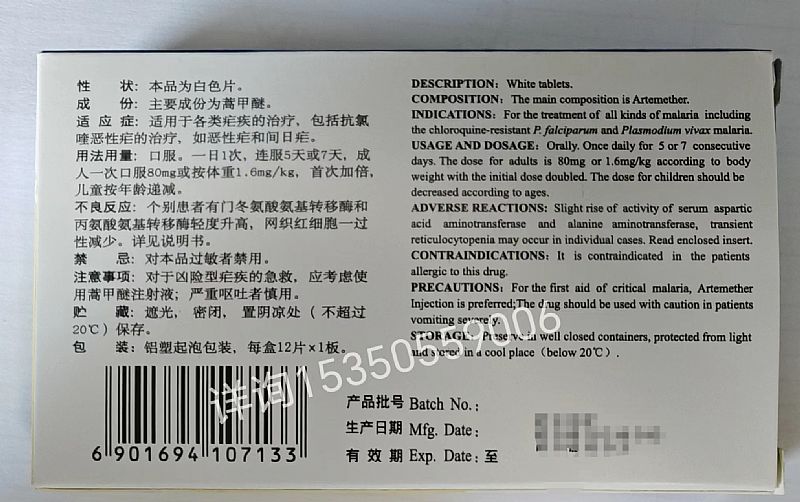 | 主要成分 | 本品主要成份為蒿甲醚 |