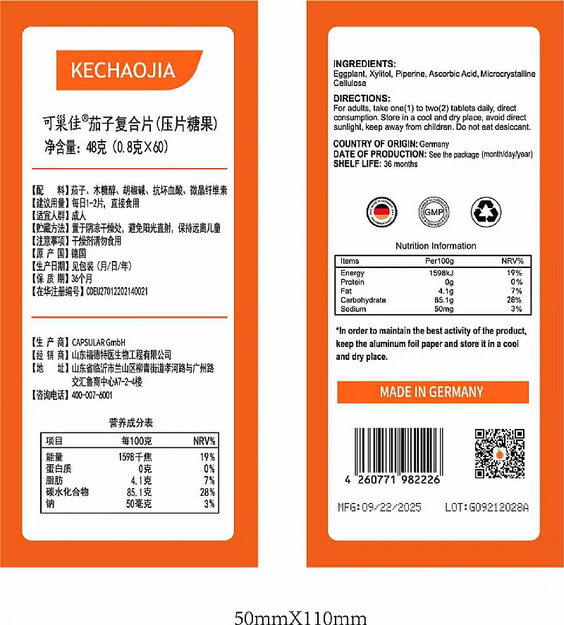 | 主要成分 | 茄子、木糖醇、胡椒堿、抗壞血酸、微晶纖維素 |