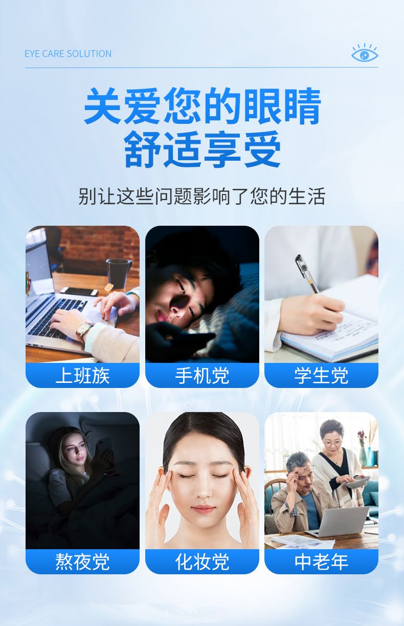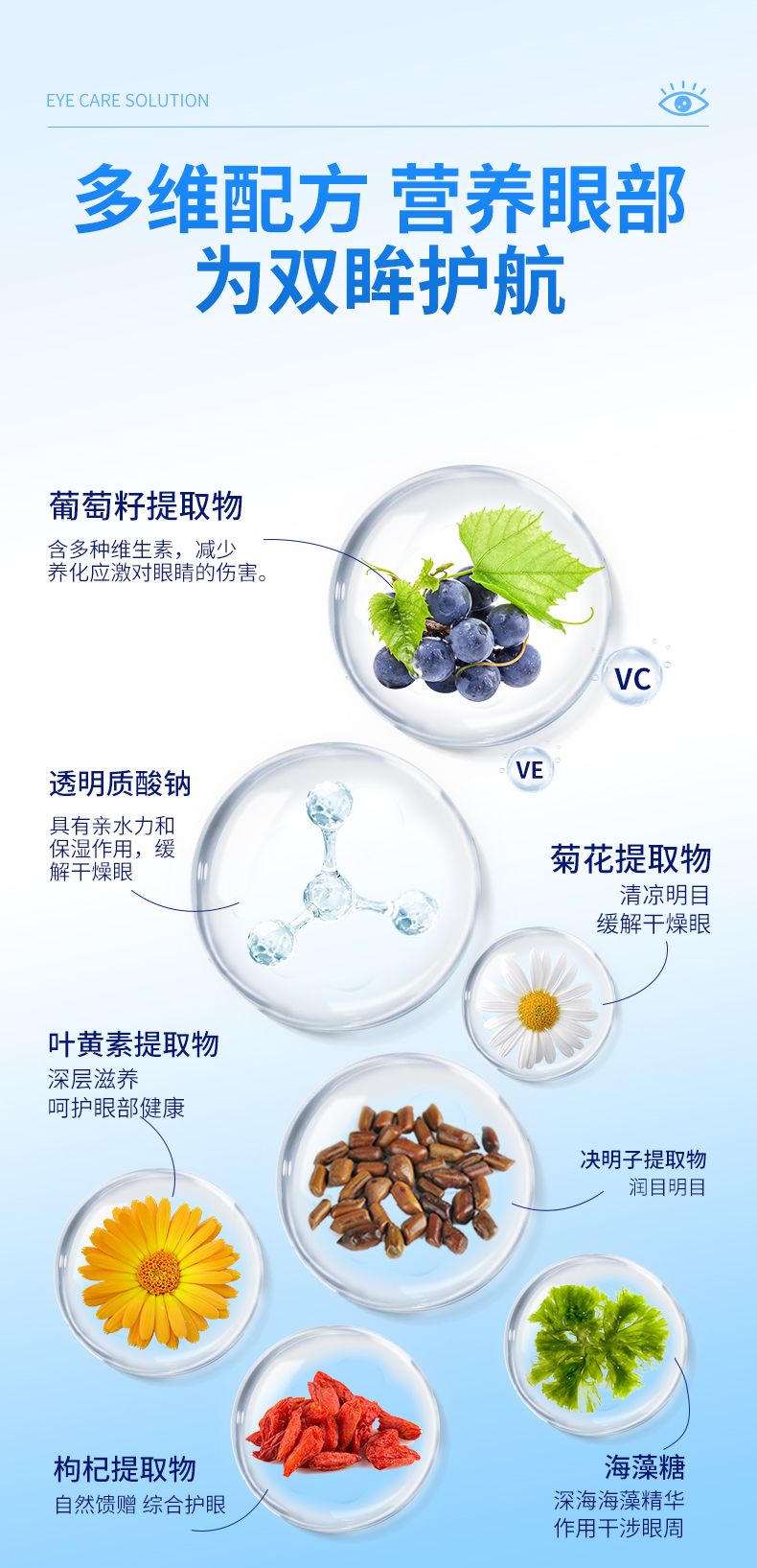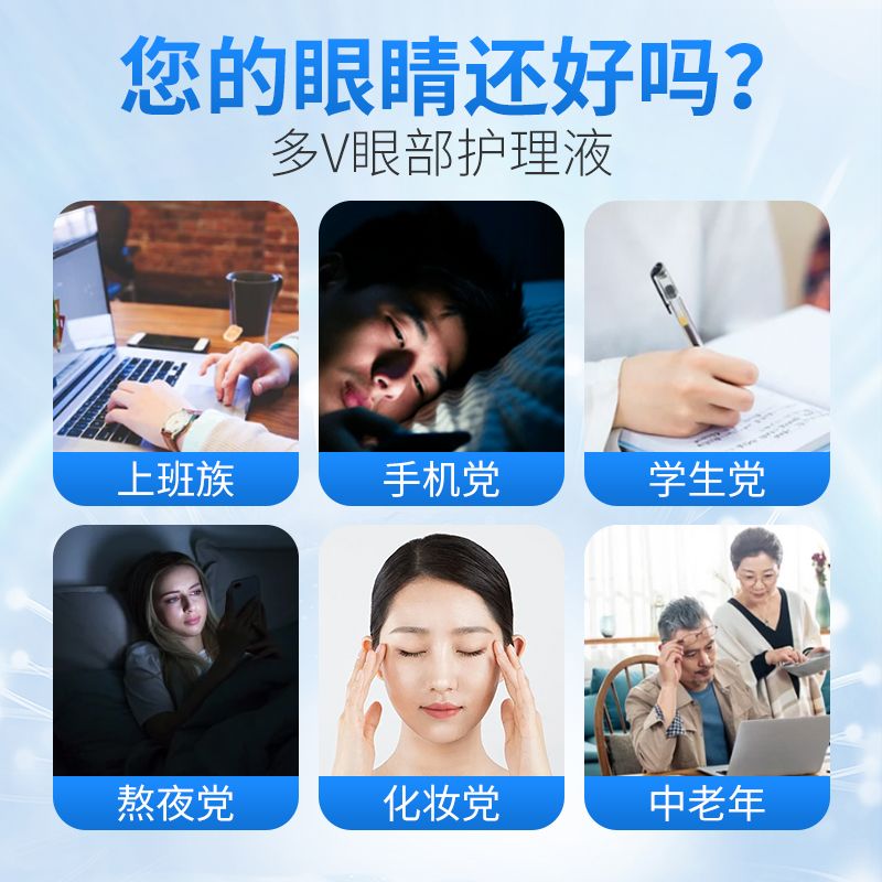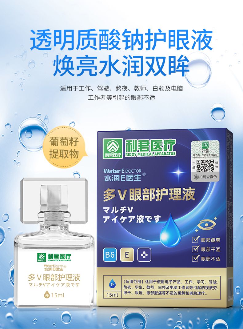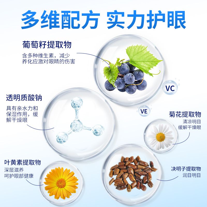 | 主要成分 | 葡萄籽提取物、透明質酸鈉、決明子提取物、菊花提取物、葉黃素提取物、枸杞提取物、維生素B6、海藻糖、純化水加工而成的多V眼部護理液。 |