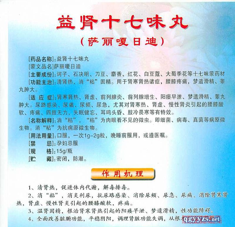 | 作用機理 | 1清腎熱,促進體內(nèi)代謝,解毒排毒。2消“粘”,消炎利尿,抗尿路感染、消除尿頻、尿急、尿痛、消除腎寒腎熱,腎虛、慢性腎炎引起的腰膝酸軟、疼痛。3溫腎固精,根治腎寒腎熱引起的陽痿早泄、夢遺滑精、腎功能障礙。4**改善臟腑功能,平穩(wěn)陰陽,調(diào)理腎臟功能失調(diào),從根本上治療腎病。 |
