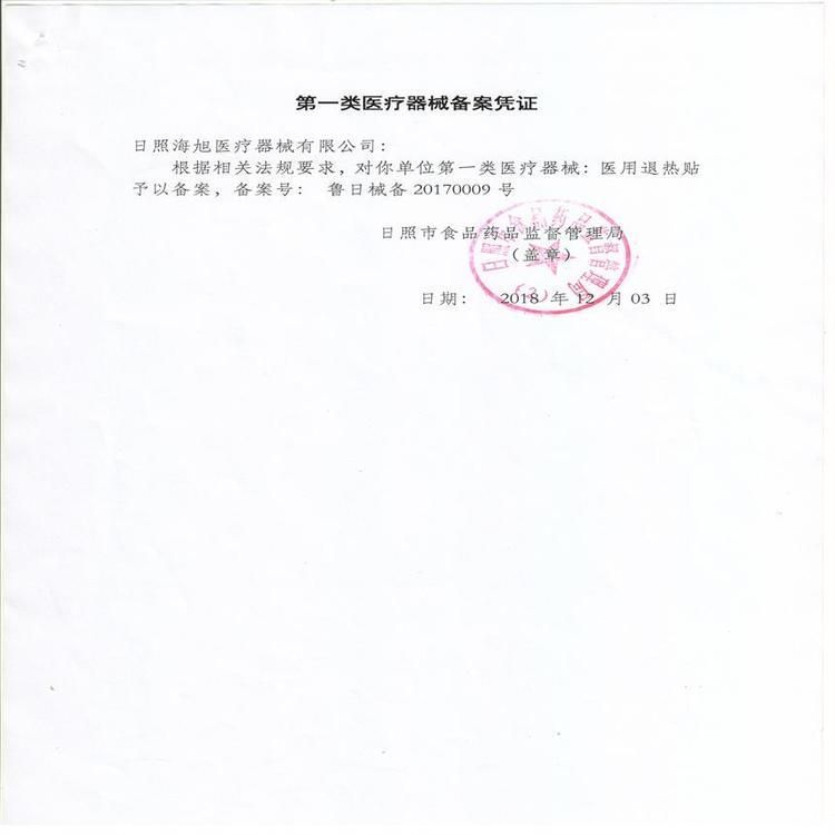| 補(bǔ)充說(shuō)明 | 【產(chǎn)品名稱(chēng)】醫(yī)用退熱貼 A、規(guī)格: 4.0cm×11cm×1 貼/袋×3 袋/盒×200 盒/件 B、注冊(cè)證號(hào): 魯日食藥監(jiān)械(準(zhǔn))字 2012 第 1580004 號(hào) C、產(chǎn)品特點(diǎn): 1、100%進(jìn)口原料生產(chǎn),品質(zhì)** 2、優(yōu)質(zhì)親水性高分子凝膠基質(zhì),保水性好,緩式釋放 3.環(huán)保型透氣高級(jí)無(wú)紡布,快速散熱 4、天然植物提取液精華,氣味清香宜人 5、12 小時(shí)持續(xù)降溫效力,退熱效果明顯 6、快速局部降溫 3-6 度,有效降低人體溫度 1-2 度 7、廣泛適應(yīng)于感冒發(fā)燒,頭痛,疲乏,肌肉關(guān)節(jié)扭傷,紅腫等的降溫 治療8、透皮吸收,物理降溫。 |