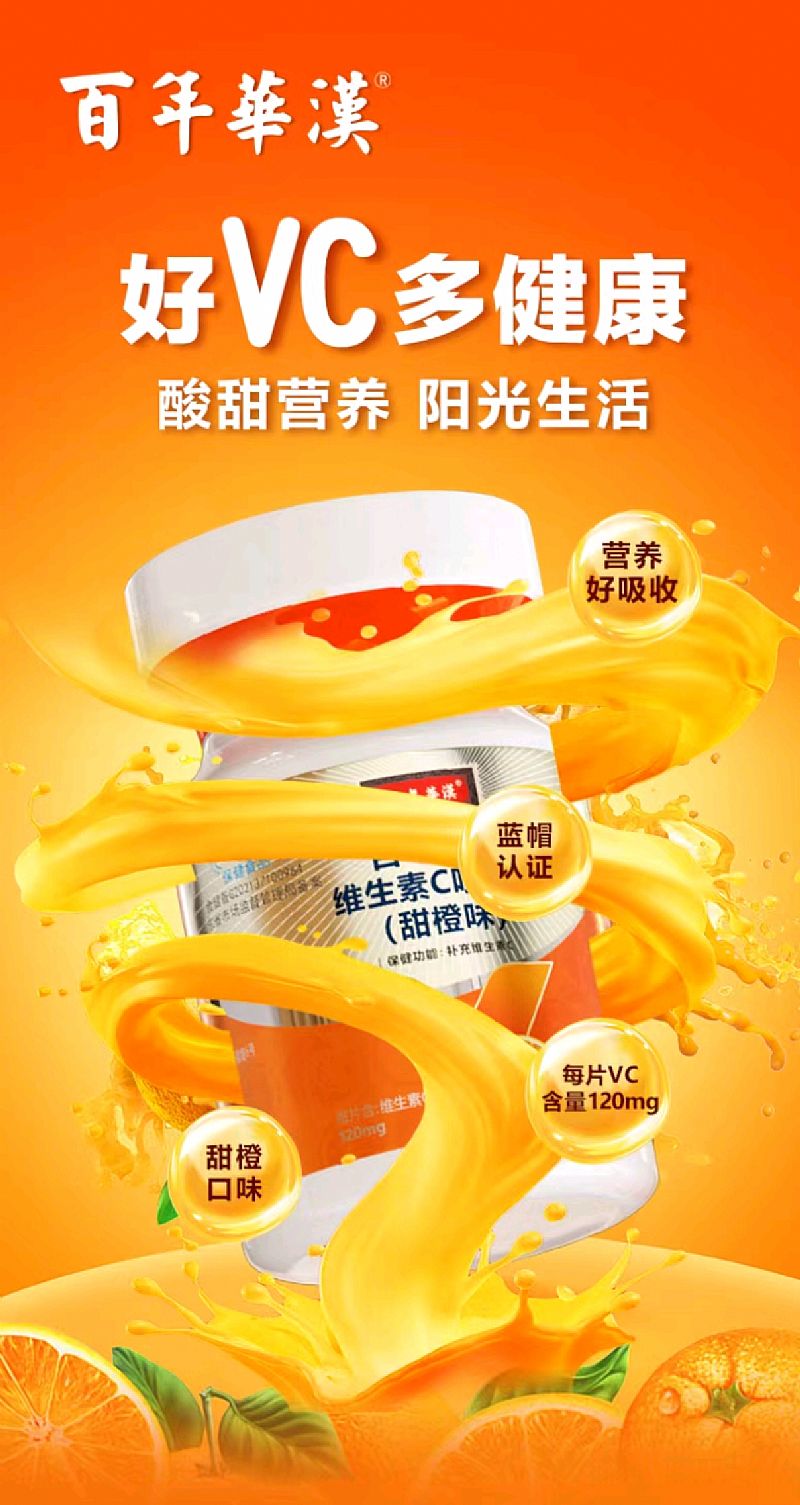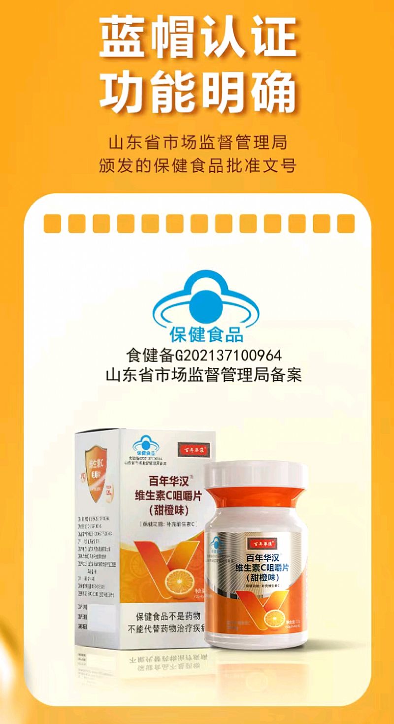 | 補充說明 | 【產(chǎn)品名稱】百年華漢·維生素C咀嚼片(甜橙味) 【產(chǎn)品規(guī)格】1.2g/片 【包裝規(guī)格】60片/瓶*100瓶/箱 【原料】L-抗壞血酸 【輔料】山梨糖醇,異麥芽酮糖醇,微晶纖維素,赤糖醇,硬脂酸鎂,聚維酮K30,三氯蔗糖,檸檬黃鋁色淀,乙基纖維素,甜香精 【功效成分及含量】每片含:維生素C120mg 【適宜人群】需要補充維生素C的成人 【不適宜人群】17歲以下人群及孕婦、乳母 【保健功能】補充維生素C 【食用量及食用方法】每日2次,每次1片,食用方法:嚼食 【貯藏方法】密閉,常溫干燥出保存 【保質(zhì)期】24個月 【注意事項】本品不能代替藥物。適宜人群外的人群不推薦食用本產(chǎn)品。不宜超過推薦量或與同類營養(yǎng)素同時食用 |