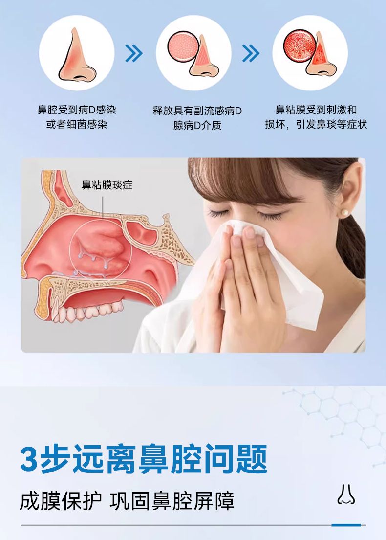 | 補(bǔ)充說(shuō)明 | 【禁忌癥】 1.對(duì)本品過(guò)敏者禁用。 2.鼻黏膜出血及嚴(yán)重破損、感染者禁用。 3.萎縮性鼻炎、干燥性鼻炎者禁用。 【注意事項(xiàng)、警示及提示性說(shuō)明】 1.本品為外用制劑,切忌內(nèi)服,應(yīng)置于兒童無(wú)法取得的地方。 2.孕婦在醫(yī)生指導(dǎo)下使用。 3.建議開(kāi)封后一個(gè)月使用完即可。 4.鑒于本產(chǎn)品的物理阻隔作用機(jī)理,目前為止,還沒(méi)有發(fā)現(xiàn)與其他藥物的相互作用。但是,和其他治療方法聯(lián)合使用前,請(qǐng)向您的醫(yī)生或藥劑師進(jìn)行咨詢。 5.如果您遇到了該包裝說(shuō)明書(shū)中并未列出的副作用或者感覺(jué)任何不適,請(qǐng)以清水沖洗,立即停止使用本產(chǎn)品,并向您的醫(yī)生或藥劑師進(jìn)行咨詢。 6.鼻內(nèi)有開(kāi)放性傷口時(shí),使用前向您的醫(yī)生或藥劑師進(jìn)行咨詢。 |
