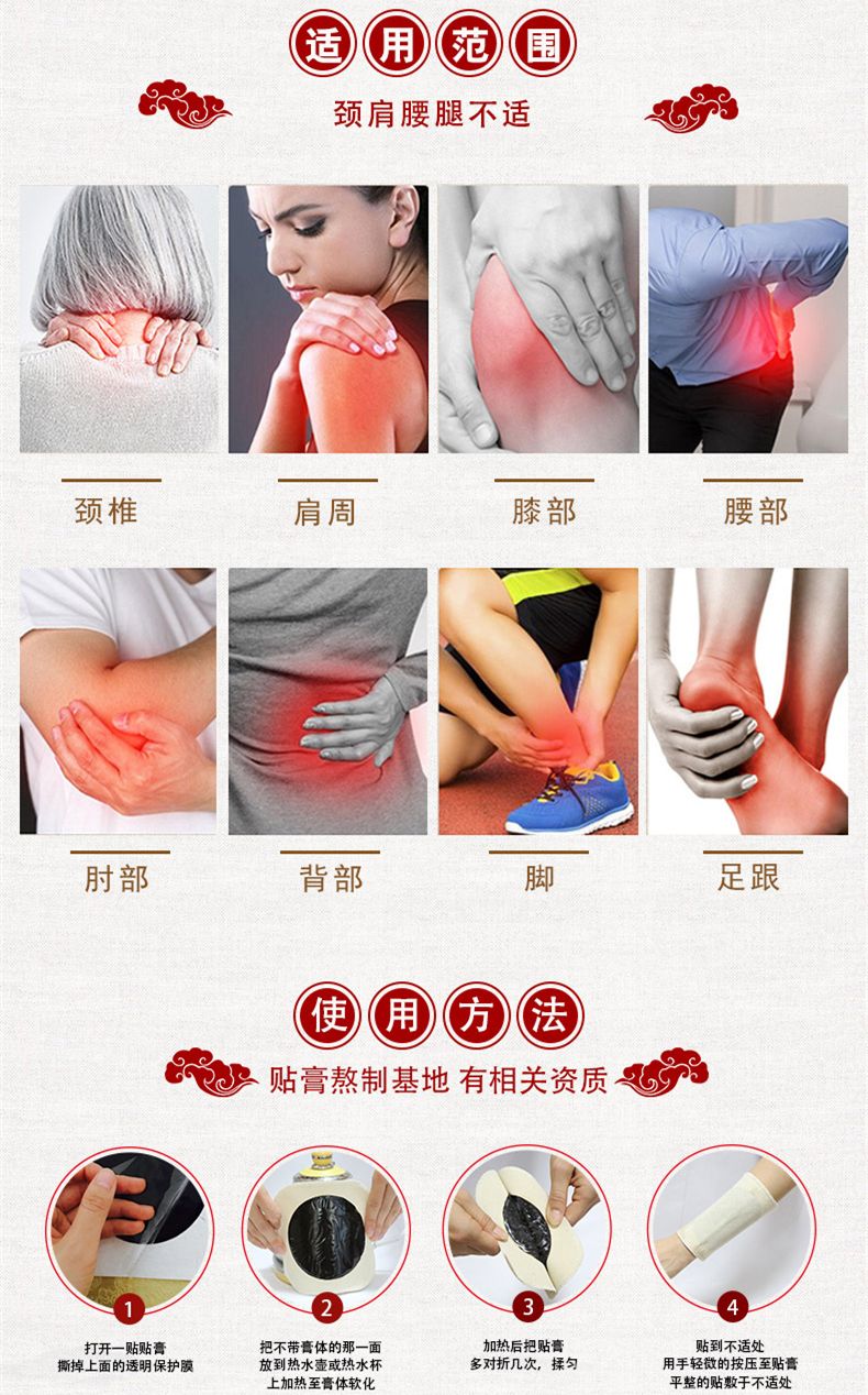 | 其它說(shuō)明 | 【膏藥注意事項(xiàng)】 1、一次性使用,用后銷毀; 2、包裝如有破損,嚴(yán)禁使用; 3、使用時(shí)嚴(yán)格按照使用說(shuō)明進(jìn)行; 4、貼敷后如有不適,應(yīng)停止貼敷。 |